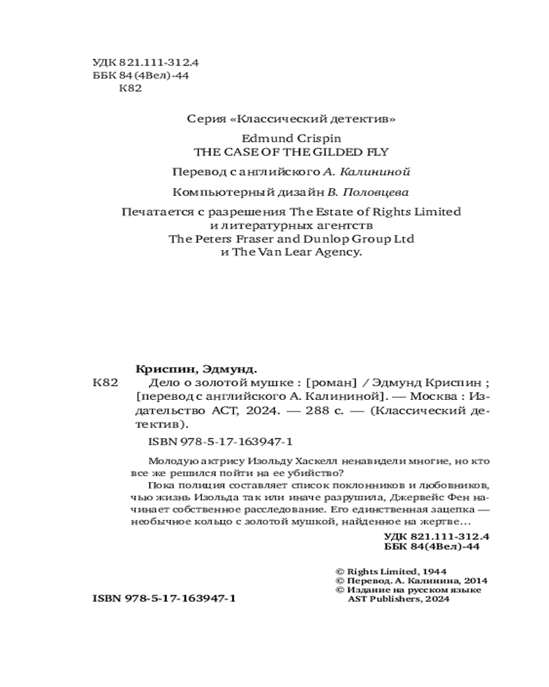 Дело о золотой мушкеВ данный момент этот товар отсутствует в продаже. Возможно, у нас найдется аналогичный или похожий товар здесь. Серия: Классический детектив Молодую актрису Изольду Хаскелл ненавидели многие, но кто все же решился пойти на ее убийство? Пока полиция составляет список поклонников и любовников, чью жизнь Изольда так или иначе разрушила, Джервейс Фен начинает собственное расследование. Его единственная зацепка — необычное кольцо с золотой мушкой, найденное на жертве... |
