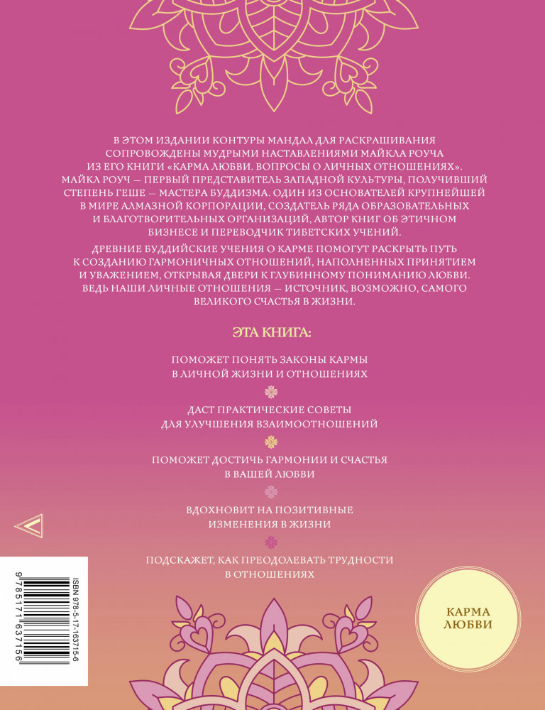 💳 Оплатить за товар можно при получении 🇰🇿 Есть бесплатная доставка по Казахстану от 1 дня 🎁 Копите бонусы с каждой покупки Серия: Мандалы для релакса В этом издании контуры мандал для раскрашивания сопровождены мудрыми наставлениями Майкла Роуча из его книги «Карма любви. Вопросы о личных отношениях». Майкл Роуч — первый представитель западной культуры, получивший степень Геше — Мастера буддизма. Один из основателей крупнейшей в мире алмазной корпорации, создатель ряда образовательных и благотворительных организаций, автор книг об этичном бизнесе и переводчик тибетских учений. Древние буддийские учения о карме помогут раскрыть путь к созданию гармоничных отношений, наполненных принятием и уважением, открывая двери к глубинному пониманию любви. Ведь наши личные отношения — источник, возможно, самого великого счастья в жизни. |