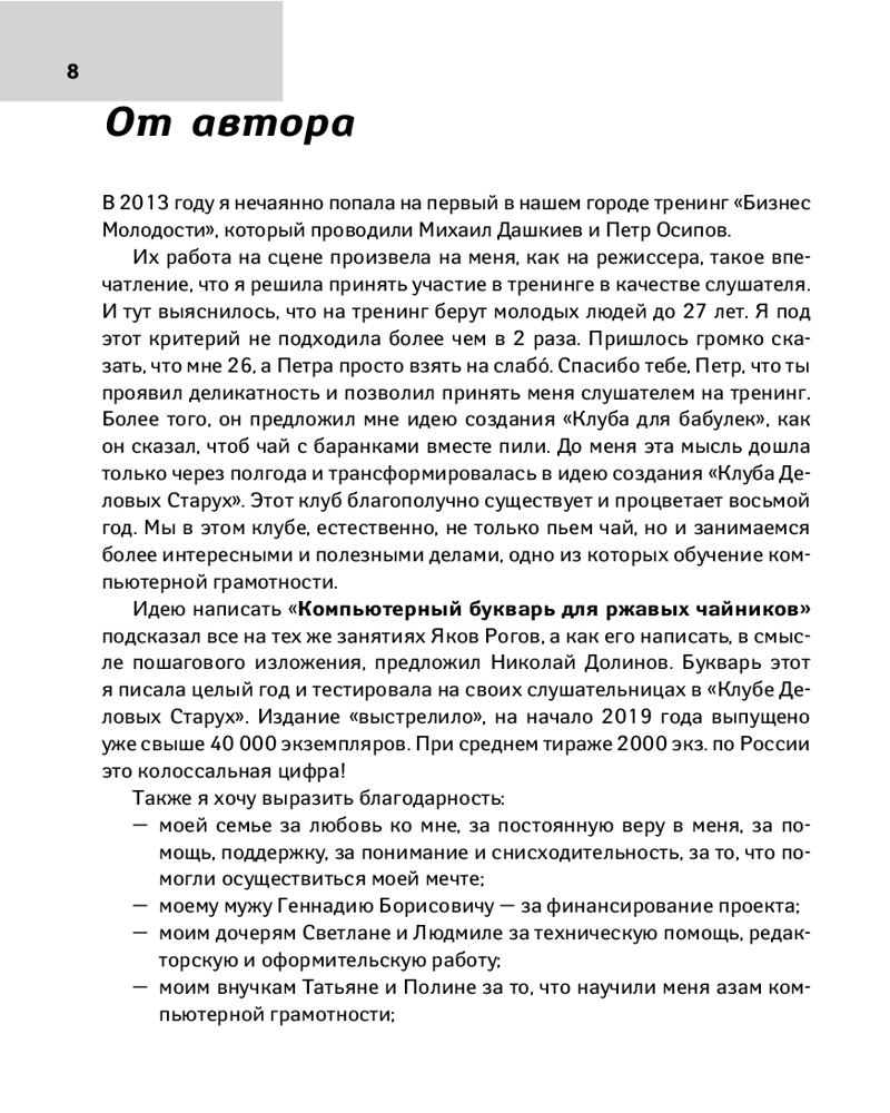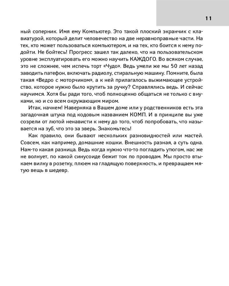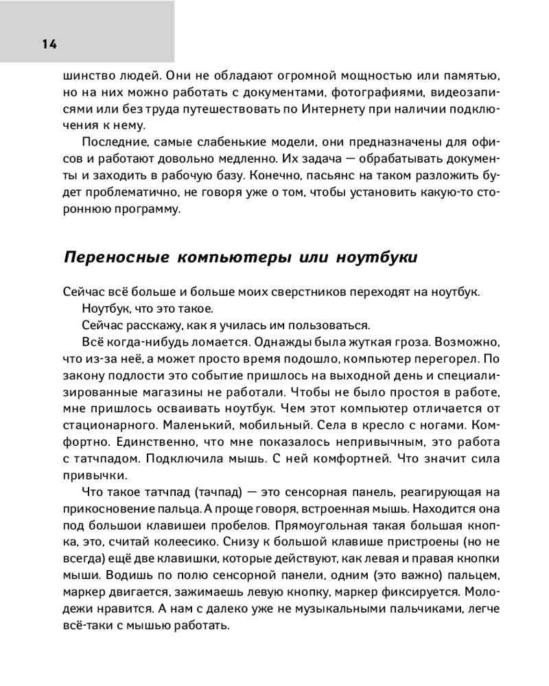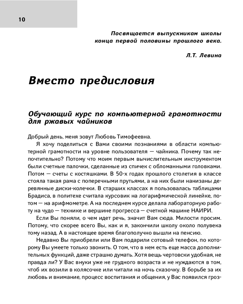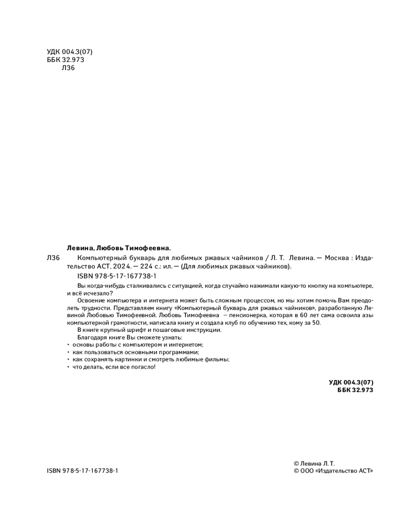 Компьютерный букварь для любимых ржавых чайниковВ данный момент этот товар отсутствует в продаже. Возможно, у нас найдется аналогичный или похожий товар здесь. Серия: Для любимых ржавых чайников Вы когда-нибудь сталкивались с ситуацией, когда случайно нажимали какую-то кнопку на компьютере, и всё исчезало? Освоение компьютера и интернета может быть сложным процессом, но мы хотим помочь Вам преодолеть трудности. Представляем книгу «Компьютерный букварь для ржавых чайников», разработанную Левиной Любовью Тимофеевной. Любовь Тимофеевна — пенсионерка, которая в 60 лет сама освоила азы компьютерной грамотности, написала книгу и создала клуб по обучению тех, кому за 50. В книге крупный шрифт и пошаговые инструкции. |