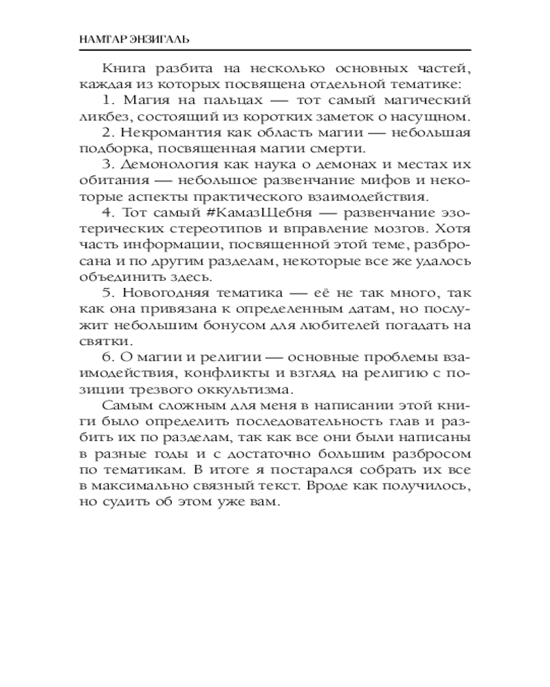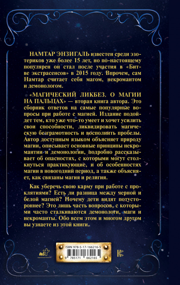 💳 Оплатить за товар можно при получении 🇰🇿 Есть бесплатная доставка по Казахстану от 1 дня 🎁 Копите бонусы с каждой покупки Серия: Тайные знания от А до Я. Лучшее Намтар Энзигаль известен среди эзотериков уже более 15 лет, но по-настоящему популярен он стал после участия в «Битве экстрасенсов» в 2015 году. Впрочем, сам Намтар считает себя магом, некромантом и демонологом. «Магический ликбез. О магии на пальцах» — вторая книга автора. Это сборник ответов на самые популярные вопросы при работе с магией. Издание подойдет тем, кто уже что-то умеет и хочет усилить свои способности, ликвидировать магическую безграмотность и восполнить пробелы. Автор доступным языком объясняет природу магии, описывает основные принципы некромантии и демонологии, подробно рассказывает об опасностях, с которыми могут столкнуться практикующие, и об особенностях магии в новогодний период, а также объясняет, как связаны магия и религия. |