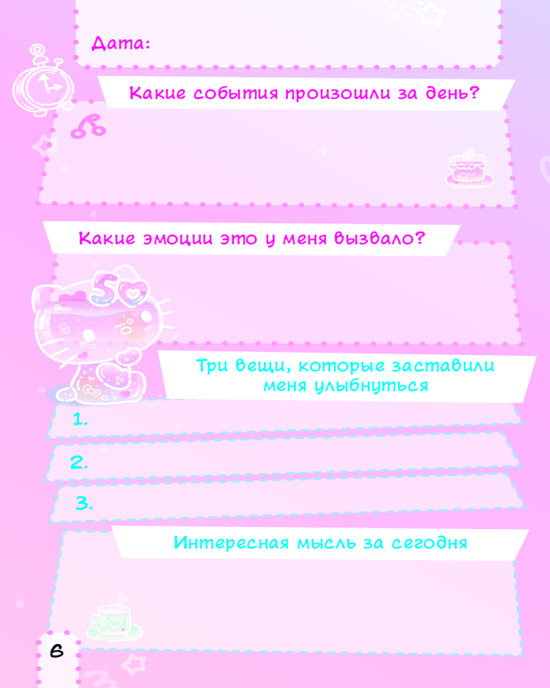 💳 Оплатить за товар можно при получении 🇰🇿 Есть бесплатная доставка по Казахстану от 1 дня 🎁 Копите бонусы с каждой покупки Серия: Hello Kitty: стикербук Привет! Я дневник Hello Kitty! Мне ты можешь доверить все свои сокровенные мысли и тайны. Я постараюсь стать для тебя настоящим другом. Со мной ты сможешь лучше понять себя и свои эмоции, определить цели, выработать полезные привычки. А ещё внутри тебя ждут интересный тест и милые наклейки! Давай знакомиться? |