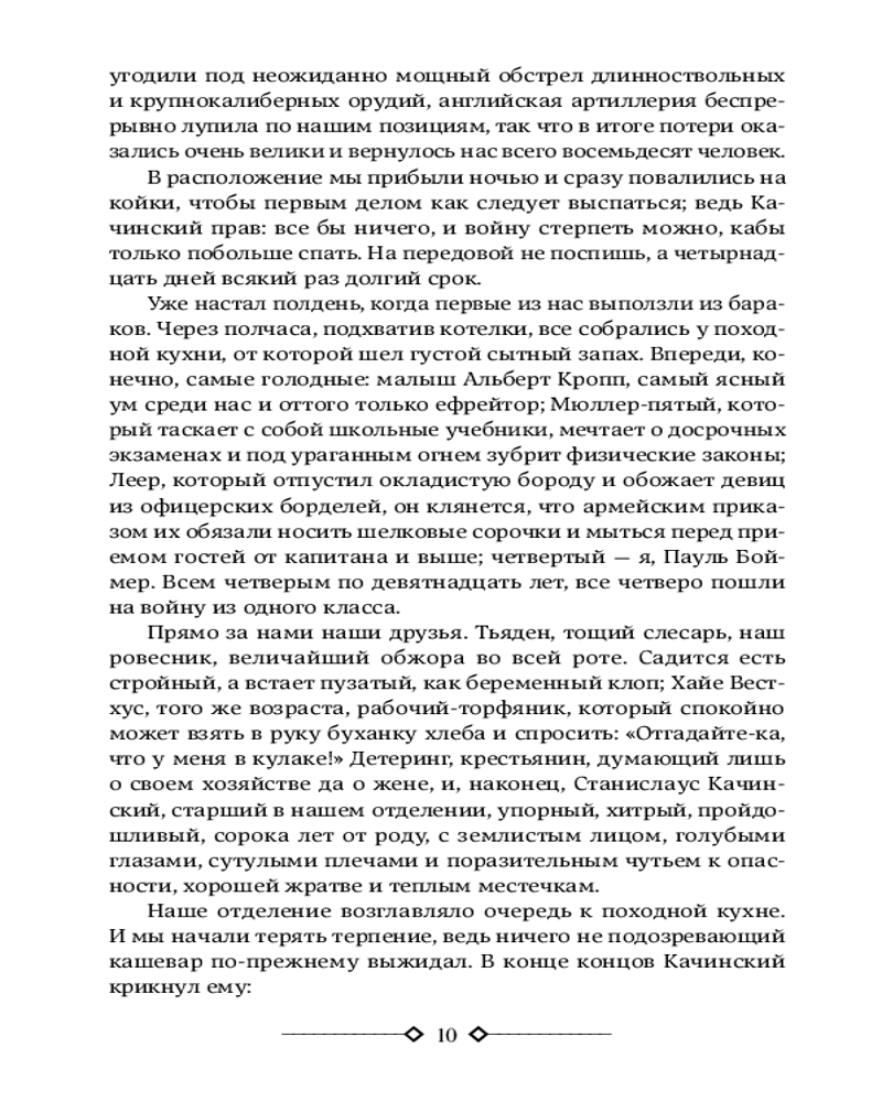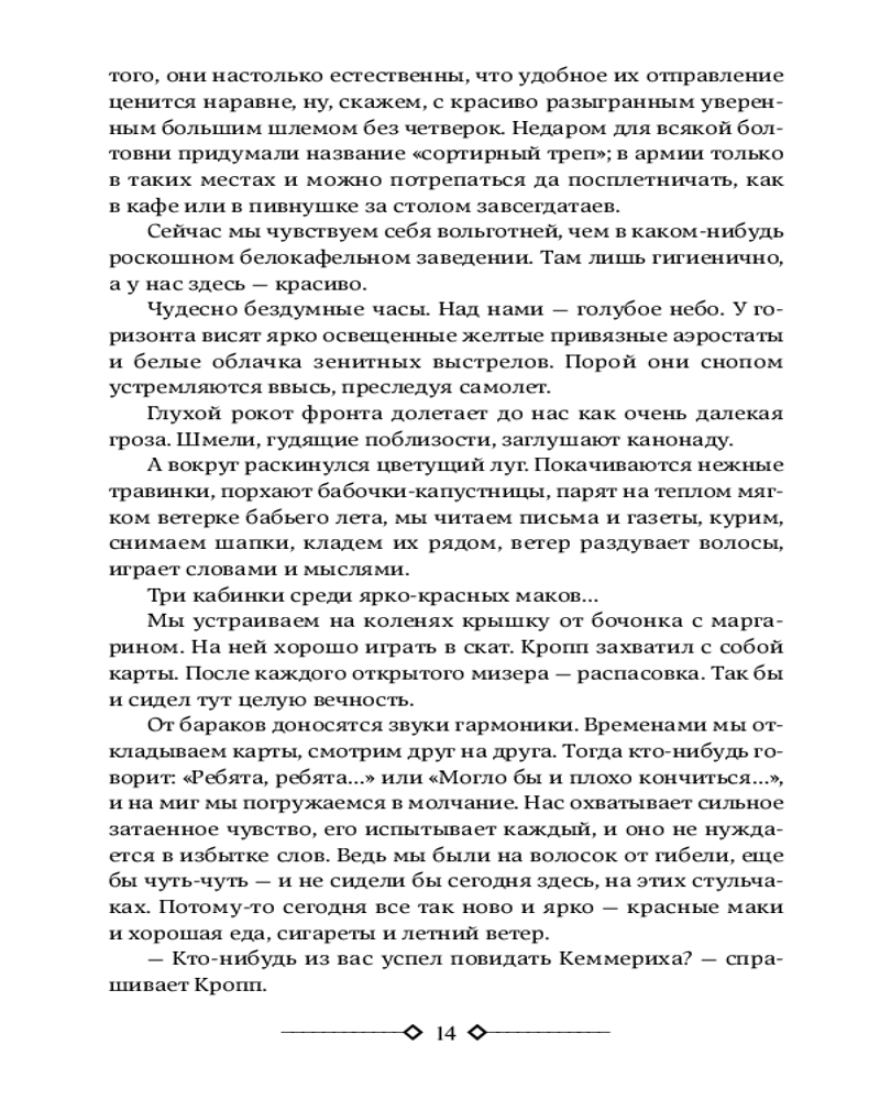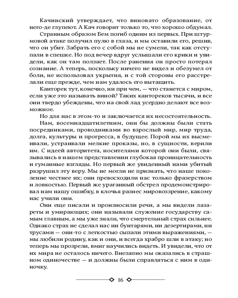 На Западном фронте без перемен. На обратном пути. Время жить и время умиратьВ данный момент этот товар отсутствует в продаже. Возможно, у нас найдется аналогичный или похожий товар здесь. Серия: Neoclassic лучшее В сборнике представлены знаменитые романы Ремарка «На Западном фронте без перемен» (1929), «На обратном пути» (1931) — произведения, повествующие о трагедии поколения, юность которого совпала с началом одной из самых страшных войн в истории человечества — Первой мировой. Когда-то они были юношами, учившимися жить и мыслить. Их вырвали из привычной жизни и швырнули в кровавую грязь войны. Теперь они — пушечное мясо. Солдаты. И учатся они — выживать и не думать. Тысячи и тысячи навеки лягут на полях Первой мировой... Тысячи и тысячи вернувшихся еще пожалеют, что не легли вместе с убитыми... |