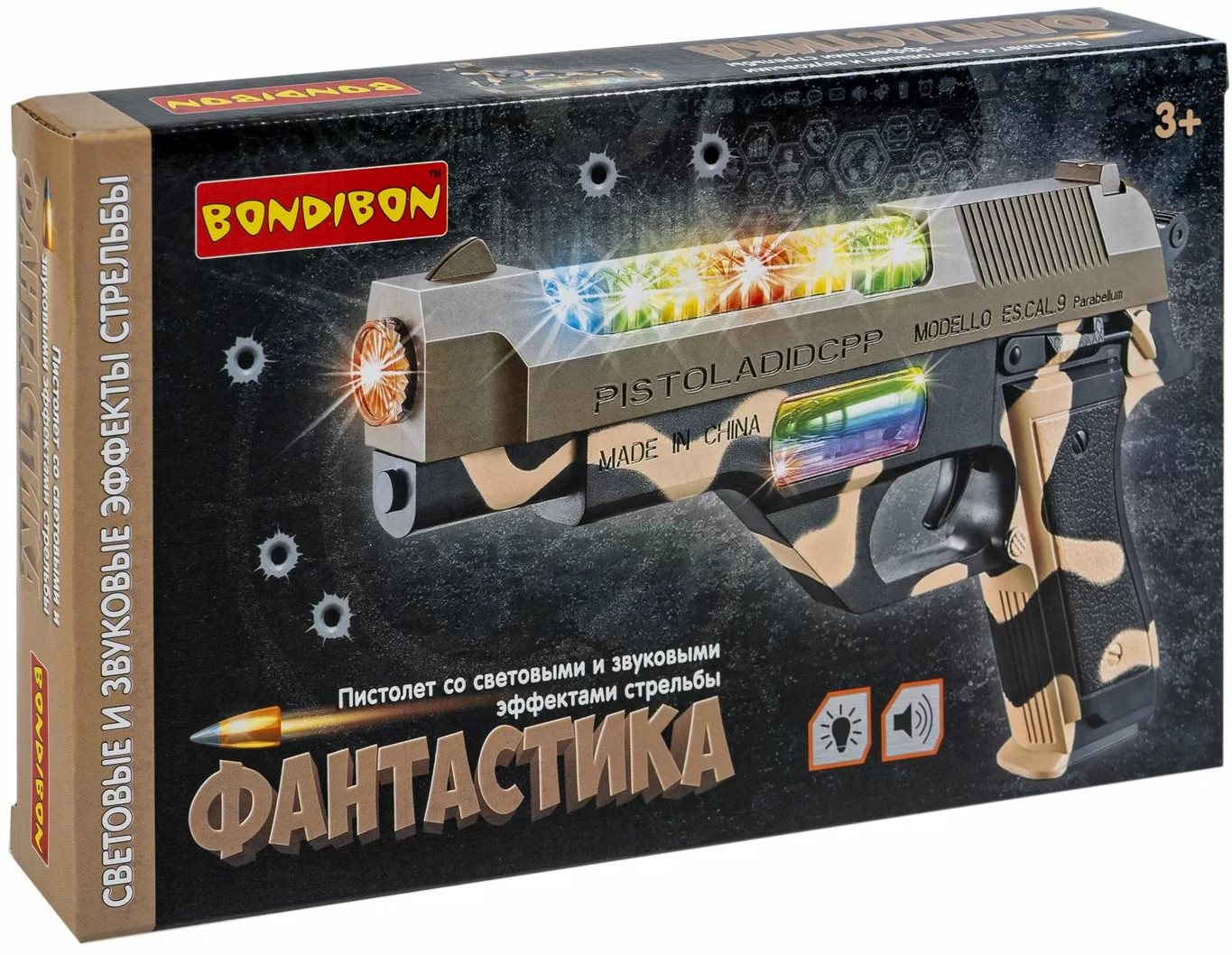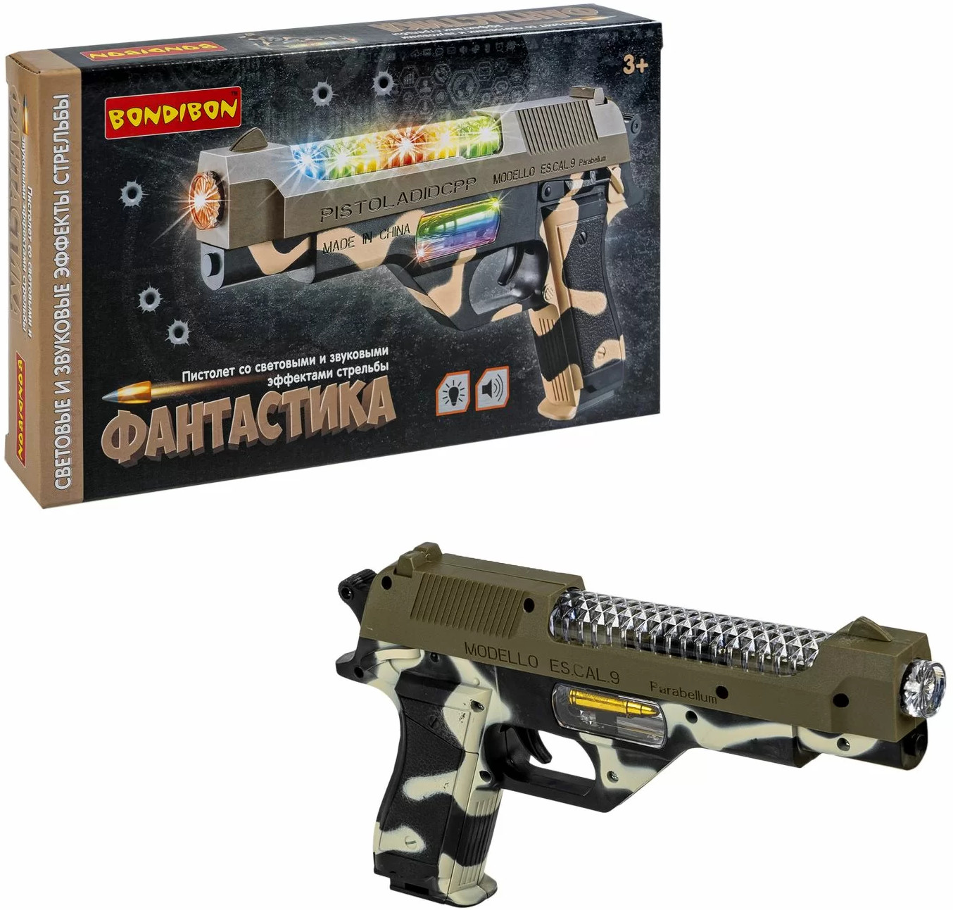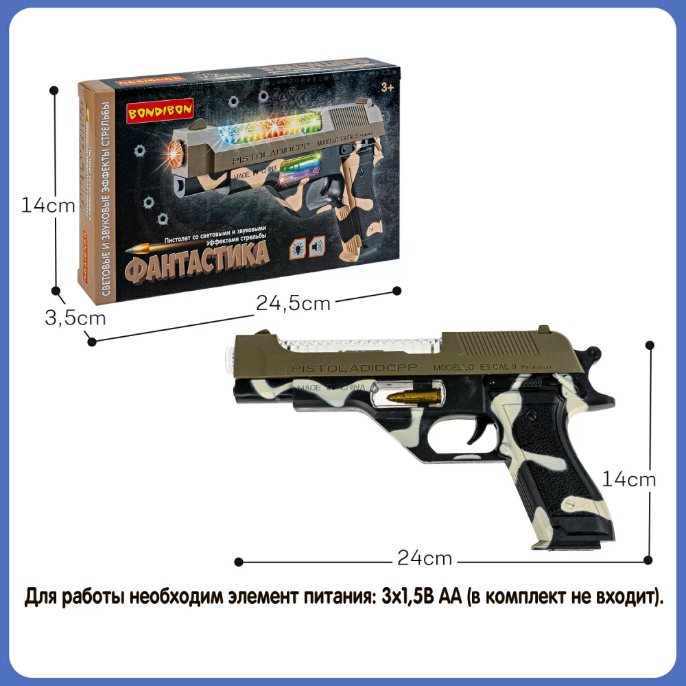 Bondibon Пистолет детскийВ данный момент этот товар отсутствует в продаже. Возможно, у нас найдется аналогичный или похожий товар здесь. Серия: Фантастика Игрушечный пистолет в расцветке камуфляжа от Bondibon с многоцветной панелью и звуковыми спецэффектами. Яркий сверкающий бластер — отличный подарок для мальчиков, ведь он дает возможность почувствовать себя сильным, храбрым и смелым. К тому же, ролевые игры с использованием детской ручки, держателем, воображением и воображением малыша. Активные игры в военную войну позволяют детям выпустить пар, а также закладывают характерные для будущих мужчин нормы и модели поведения. Например, стремление быть защитником и воином. Начать играть просто. Вставьте батарейки, нажмите на курок. Игрушка размером 28 × 18 см, в расцветке черно-коричневого камуфляжа, с эффектной разноцветной панелью. Выберите сверкающий пистолет серии Фантастика от Бондибона в подарок ребенку и удивите его в День рождения, на Новый год или любой другой праздник. Подарите неповторимые эмоции! |