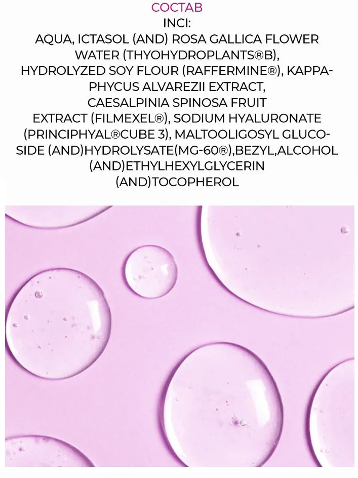 • природный биополимер из колючей и красных водорослей формирует надежный биобарьер, который защищает дерму от негативного воздействия вредных веществ, снижает потерю влаги и не оставляет ощущения липкости;
