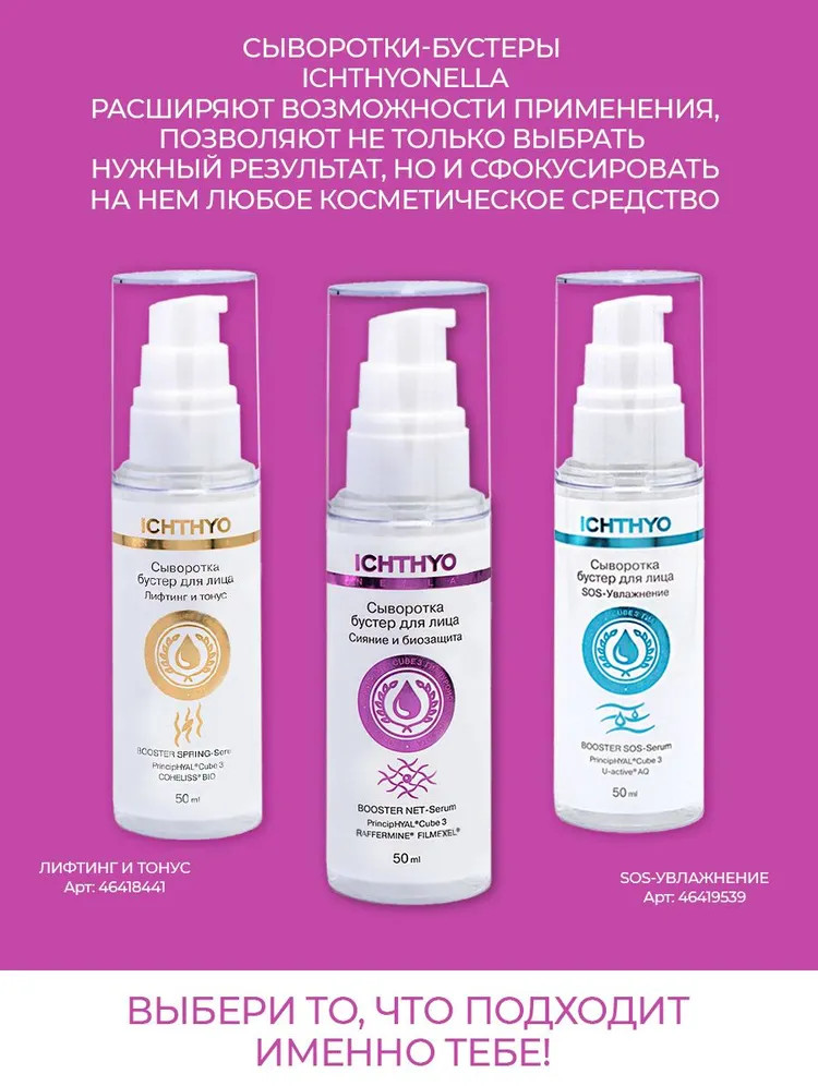 Увлажняющая сыворотка органично вводится в утренний и вечерний уход, может использоваться самостоятельно — для быстрого достижения желаемого результата или в качестве активной добавки в привычное средство, дополняя и усиливая его действие. Во втором случае нужно ввести несколько капель в крем, аккуратно перемешать и нанести на кожу. Сыворотки Ихтионелла расширяют возможности применения, позволяют не только выбрать нужный результат, но и сфокусировать на нём любое косметическое средство!