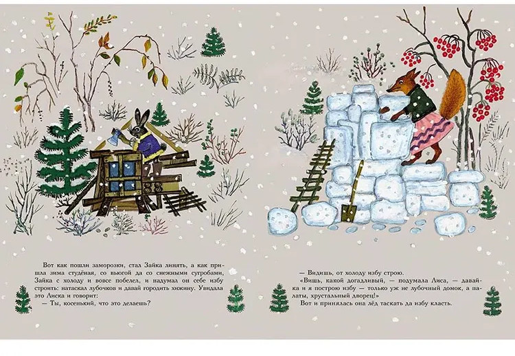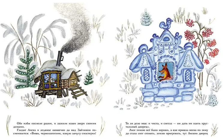 Художник нарисовал выразительных и запоминающихся персонажей. Хозяйственный и трудолюбивый зайчик запасает на зиму капусту и морковку, топориком мастерит теплую избушку; а вот лисичка несмотря на изворотливый ум просчиталась: вместо теплого домика из лубочков соорудила себе «хрустальный дворец» из снега и льда.