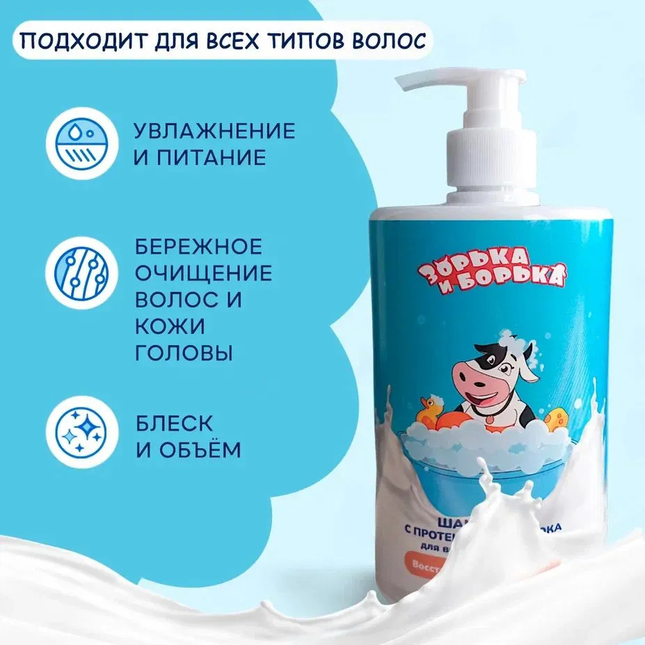 Зорька и Борька Шампунь для всех типов волос с протеинами молока «Восстановление и блеск»