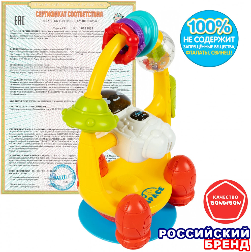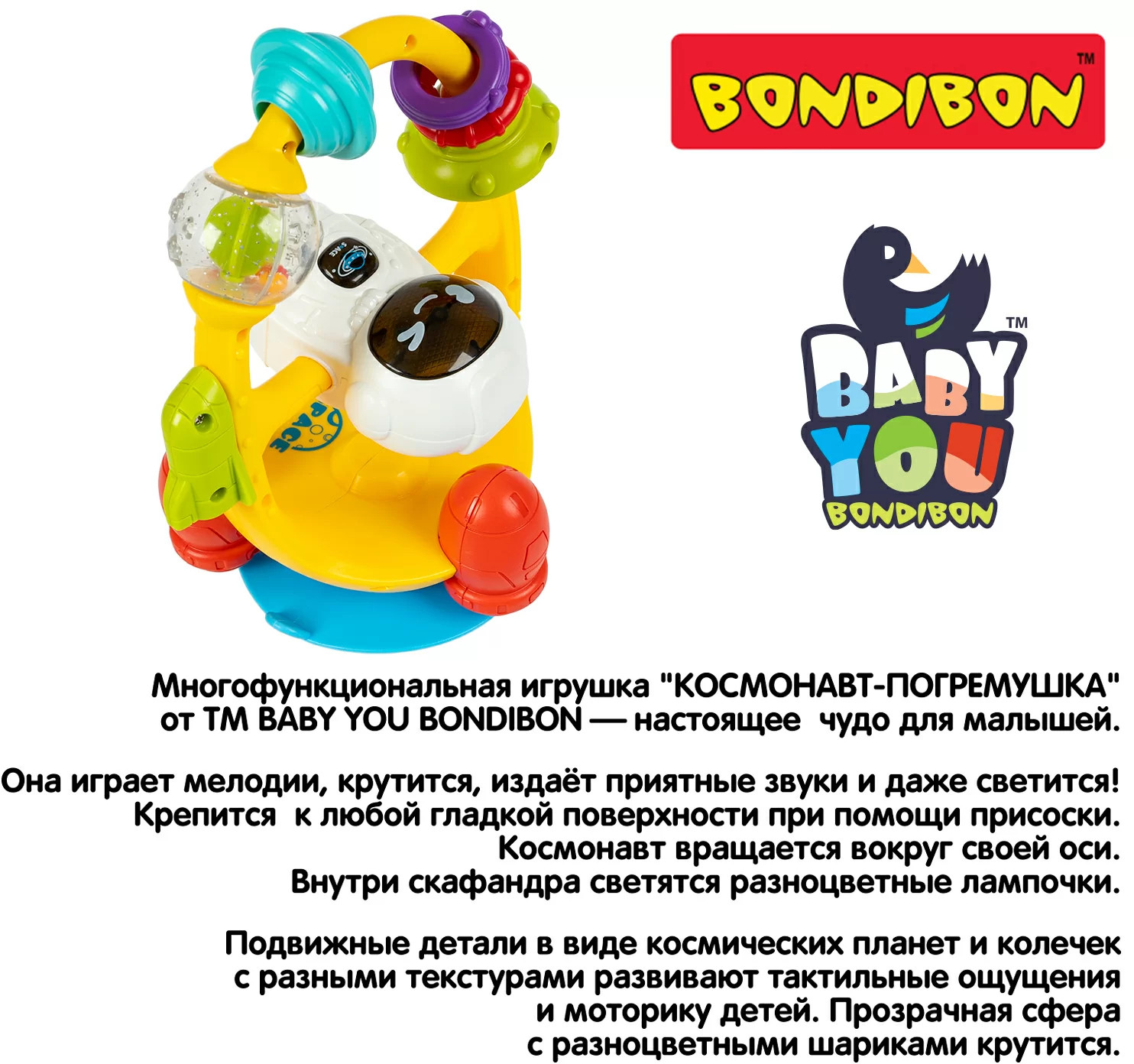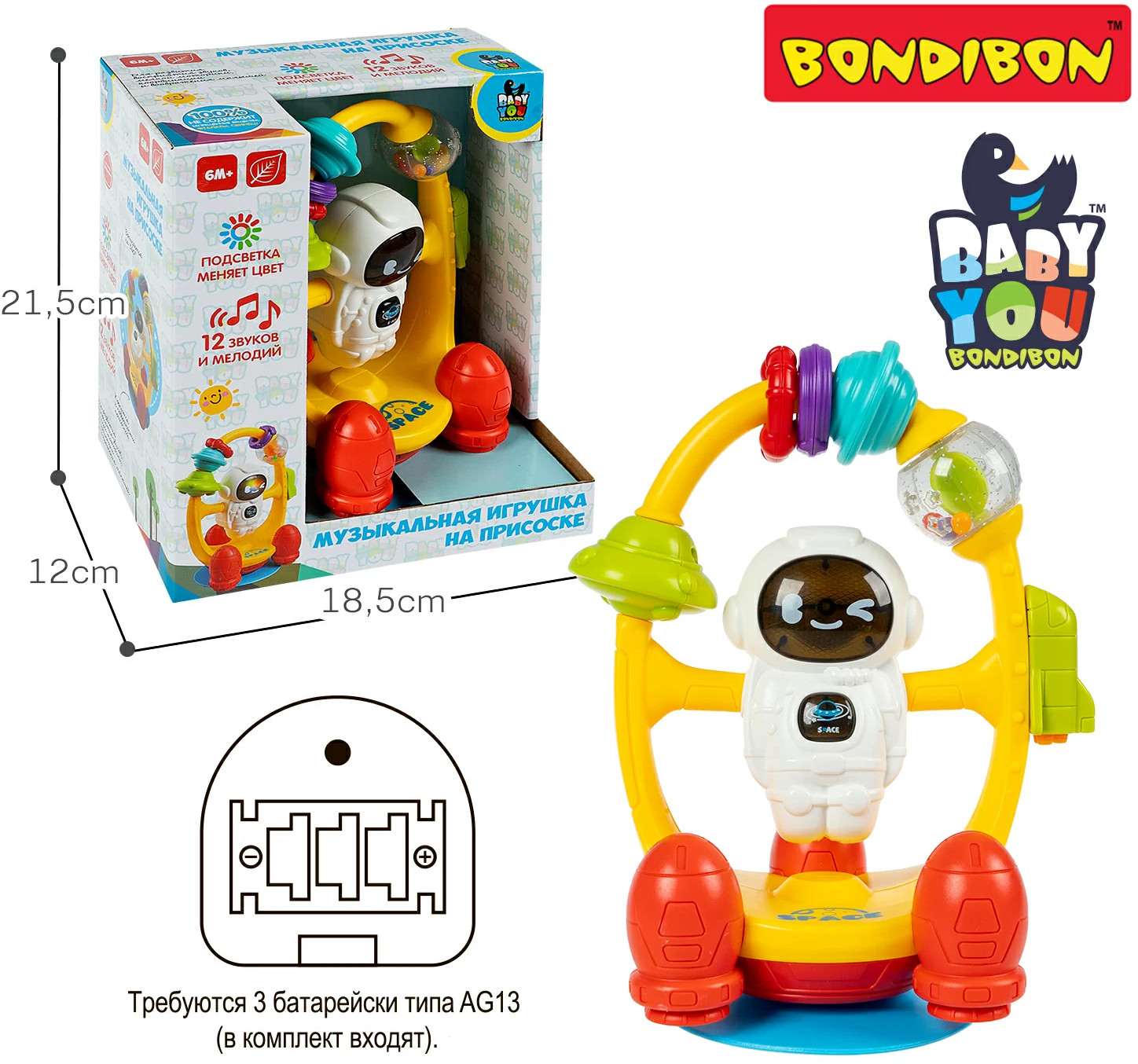 Bondibon Игрушка музыкальная на присоске «Погремушка Космонавт»В данный момент этот товар отсутствует в продаже. Возможно, у нас найдется аналогичный или похожий товар здесь. Серия: Baby You Отправьтесь в космическое путешествие с музыкальной игрушкой на присоске «Погремушка Космонавт» серии Baby You от Bondibon! Музыкальная развивающая игрушка порадует малыша 12 звуками и мелодиями, разноцветная подсветка космонавта, вращающаяся на 360° градусов, привлечет внимание и станет причиной познавательного веселья. Крепкая присоска позволяет закрепить погремушку к столу или любой другой гладкой поверхности, давая ребенку возможность самостоятельно ее рассмотреть. Тактильные колечки на верхней дужке погремушки развивают мелкую моторику и координацию движений. Благодаря яркому дизайну и разнообразию функций, музыкальная игрушка «Погремушка Космонавт» от Bondibon станет любимой игрушкой вашего ребенка и откроет ему дверь в мир звуков, музыки и познания. Развивающие игрушки серии Baby You выполнены из безопасных материалов и соответствуют стандартам качества бренда Bondibon. |