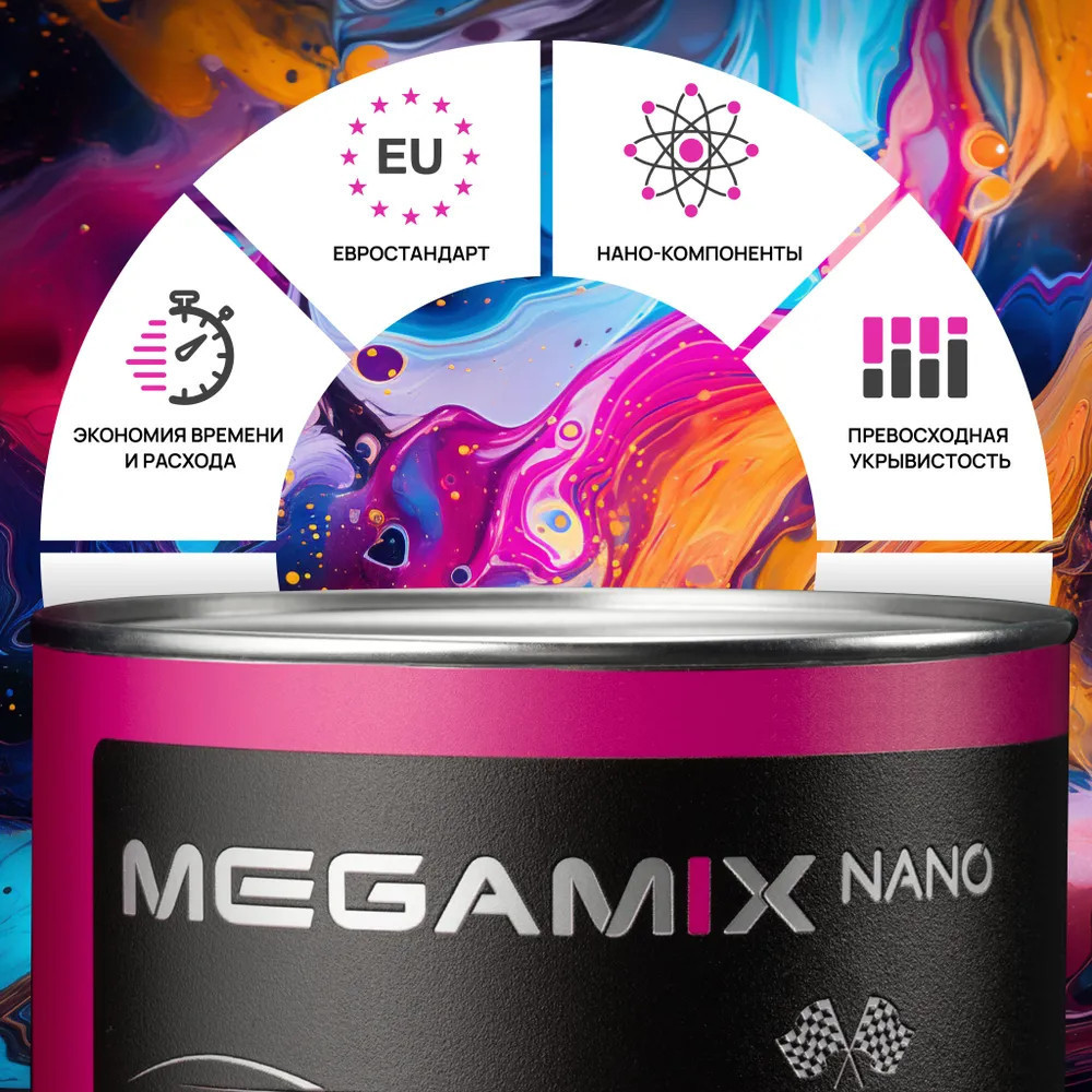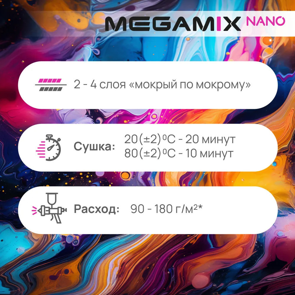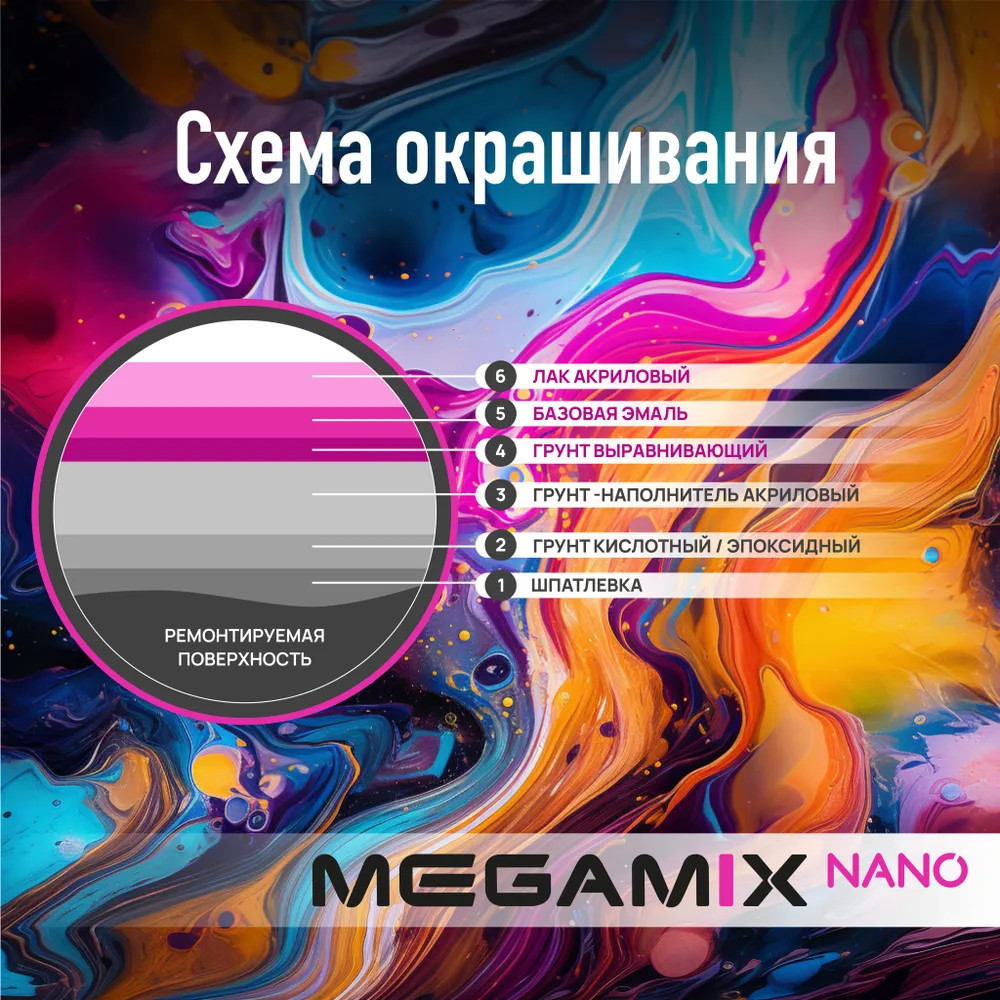 Готовая базисная эмаль MegaMix применяется в 2-х-слойных системах покрытия (база + лак) для ремонта легковых иномарок, отделочной окраски кузовов автобусов, грузовиков, а также окраски различных пластиковых и металлических предметов. Автоэмаль обладает хорошей укрывающей способностью, легка и удобна в применении. Авто эмаль может использоваться как для локального ремонта машины, так и для полной окраски кузова автомобиля. После нанесения прозрачных лаков получается блестящее, прочное, стойкое к атмосферным и другим воздействиям лакокрасочное покрытие. Готовая автомобильная эмаль поставляется в неразбавленном виде. При подготовке к нанесению эмали необходимо разбавить до рабочего состояния оригинальным разбавителем MegaMix для металликов.