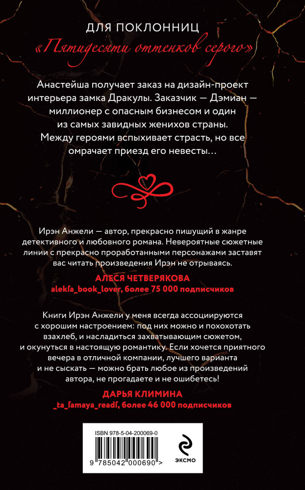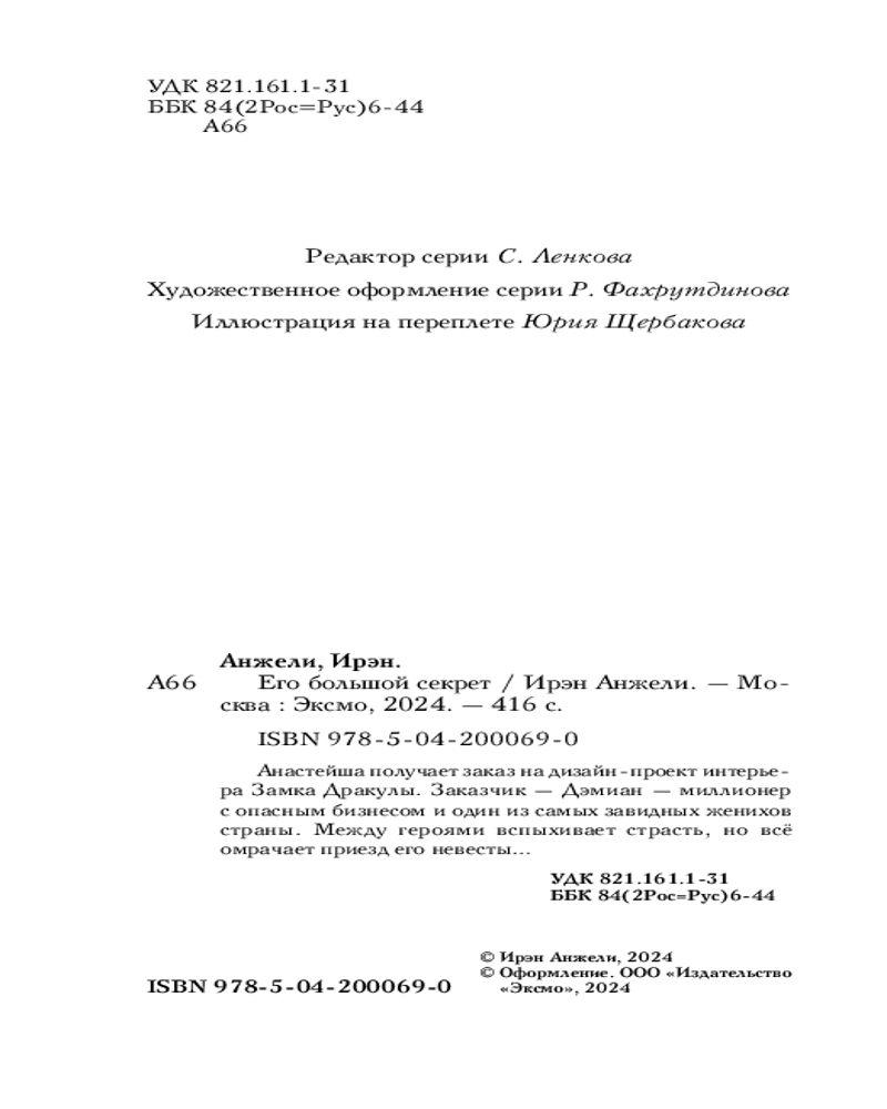 Его большой секретВ данный момент этот товар отсутствует в продаже. Возможно, у нас найдется аналогичный или похожий товар здесь. Серия: Один удар сердца. Любовные романы Ирэн Анжели Анастейша получает заказ на дизайн-проект интерьера Замка Дракулы. Заказчик — Дэмиан — миллионер с опасным бизнесом и один из самых завидных женихов страны. Между героями вспыхивает страсть, но всё омрачает приезд его невесты... |