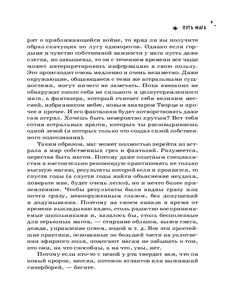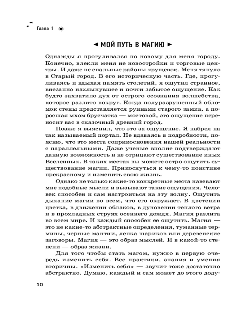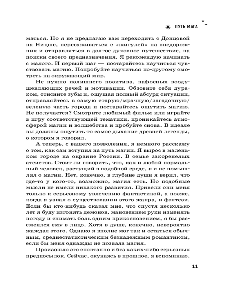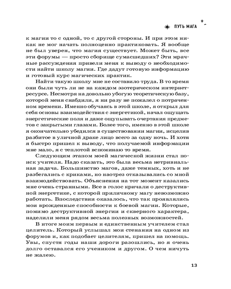 «Много лет назад, когда я делал свои первые робкие шаги на пути магического развития, мне пришлось очень долго искать информацию. И, прямо скажем, лучше бы мне никогда не знать многое из того, что мне приходилось читать. Однако совершенно случайно я столкнулся с несколькими практиками, которые позволили мне сперва осознать первые намеки на существование магии в нашем мире, а затем ощутить на себе ее действие. Это, в свою очередь, позволило мне понять и принять тот факт, что магия не где-то там, не с кем-то другим — она прямо здесь, достаточно просто сесть и начать практиковать. Путем, которым прошел когда-то я сам, я хотел бы поделиться с вами. В этой книге и в последующих шаг за шагом я буду знакомить вас с магией, минуя те ошибки и заблуждения, через которые мне самому пришлось пройти. Полная картина магического мира сформировалась у меня далеко не сразу. На это ушли многие годы. Но теперь я могу поделиться с вами уже не разрозненными знаниями, которые с огромным трудом собирал по крупицам, а полноценной магической системой, в которой вы сможете развиваться и шаг за шагом постигать магию от простого к сложному», — Маг Саргас. |