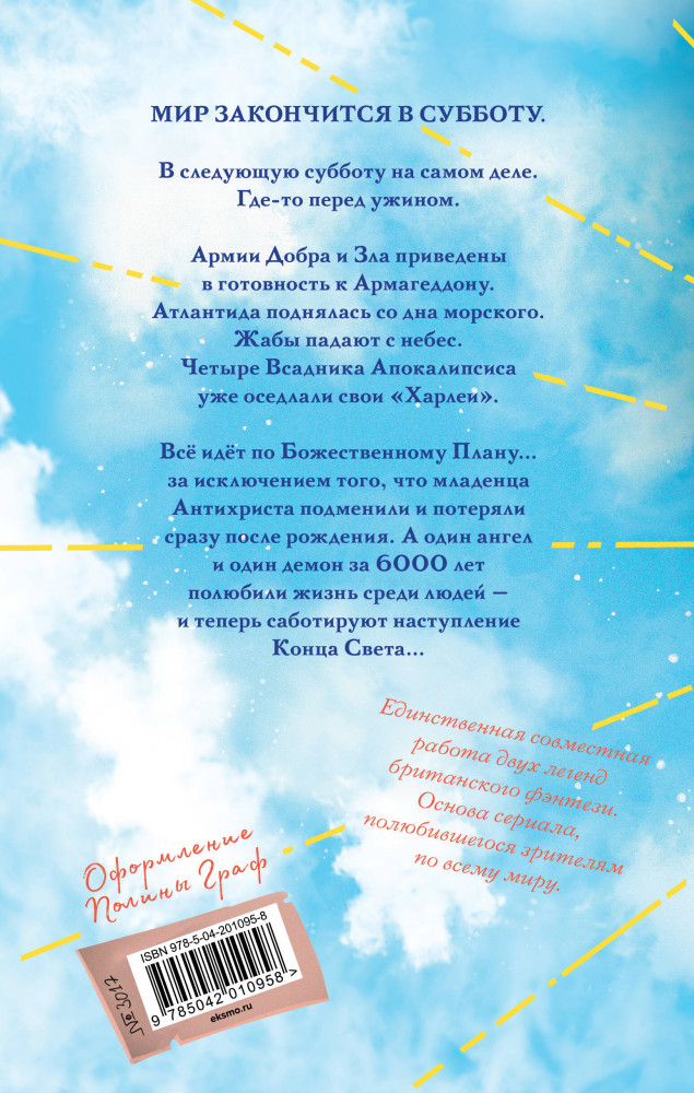 💳 Оплатить за товар можно при получении 🇰🇿 Есть бесплатная доставка по Казахстану от 1 дня 🎁 Копите бонусы с каждой покупки Серия: Магия Терри Пратчетта в иллюстрациях Полины Граф Мир закончится в субботу. В следующую субботу на самом деле. Где-то перед ужином. Армии Добра и Зла приведены в готовность к Армагеддону. Атлантида поднялась со дна морского. Жабы падают с небес. Четыре Всадника Апокалипсиса уже оседлали свои «Харлеи». Всё идёт по Божественному Плану... за исключением того, что младенца Антихриста подменили и потеряли сразу после рождения. А один ангел и один демон за 6000 лет полюбили жизнь среди людей — и теперь саботируют наступление Конца Света... |