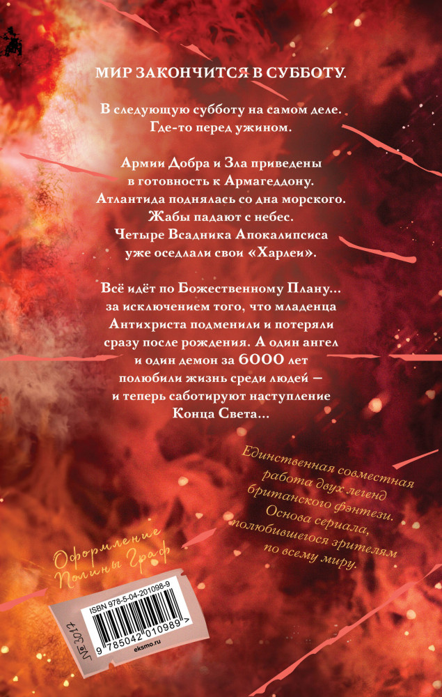 💳 Оплатить за товар можно при получении 🇰🇿 Есть бесплатная доставка по Казахстану 🎁 Копите бонусы с каждой покупки Серия: Магия Терри Пратчетта в иллюстрациях Полины Граф Мир закончится в субботу. В следующую субботу на самом деле. Где-то перед ужином. Армии Добра и Зла приведены в готовность к Армагеддону. Атлантида поднялась со дна морского. Жабы падают с небес. Четыре Всадника Апокалипсиса уже оседлали свои «Харлеи». Всё идёт по Божественному Плану... за исключением того, что младенца Антихриста подменили и потеряли сразу после рождения. А один ангел и один демон за 6000 лет полюбили жизнь среди людей — и теперь саботируют наступление Конца Света... |