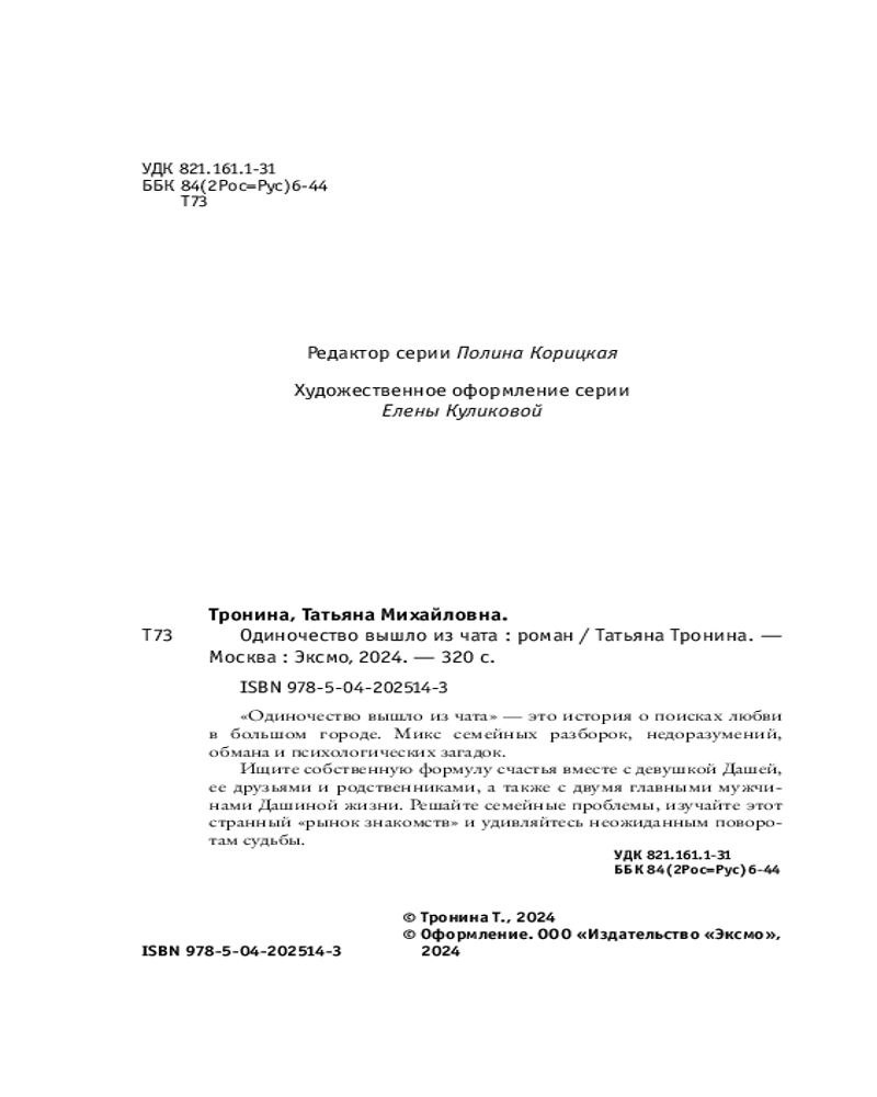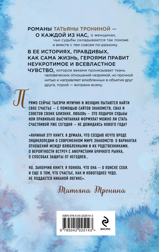 💳 Оплатить за товар можно при получении 🇰🇿 Есть бесплатная доставка по Казахстану от 1 дня 🎁 Копите бонусы с каждой покупки Серия: Нити любви. Романы Т. Трониной Что делать, если кажется, будто жизнь проходит мимо? Привлечь к поиску второй половинки популярную психологию, как в классической истории «Самая обаятельная и привлекательная»? Делиться с друзьями своими наблюдениями о жизни, людях и знакомствах с противоположным полом, как в сериалах «Друзья» и «Секс в большом городе»? Даше кажется, что она всё упустила — и собственную жизнь, и перспективного жениха, и возможность сделать карьеру... Но она решила не сдаваться и подошла к вопросу поиска избранника со всей серьезностью. Девушку ждали удивительные открытия на пресловутом «брачном рынке»... Существует ли она, эта уникальная формула счастья? Есть ли надежда обрести любовь в наступающем году? |