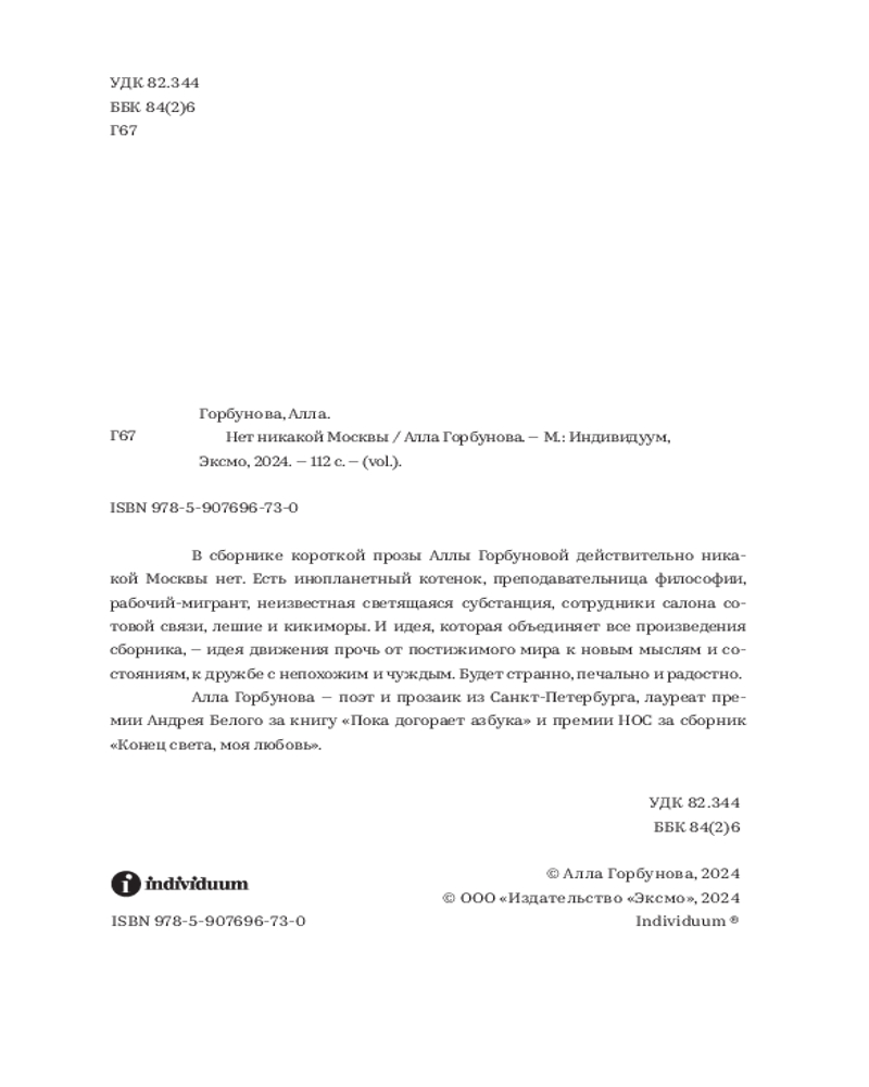 💳 Оплатить за товар можно при получении 🇰🇿 Есть бесплатная доставка по Казахстану 🎁 Копите бонусы с каждой покупки Серия: Individuum В сборнике короткой прозы Аллы Горбуновой действительно никакой Москвы нет. Есть инопланетный котенок, преподавательница философии, рабочий-мигрант, неизвестная светящаяся субстанция, сотрудники салона сотовой связи, лешие и кикиморы. И идея, которая объединяет все произведения сборника, — идея движения прочь от постижимого мира к новым мыслям и состояниям, к дружбе с непохожим и чуждым. Будет странно, печально и радостно. |