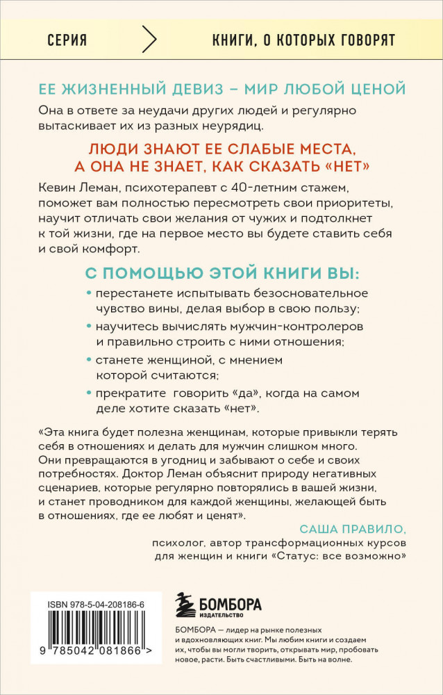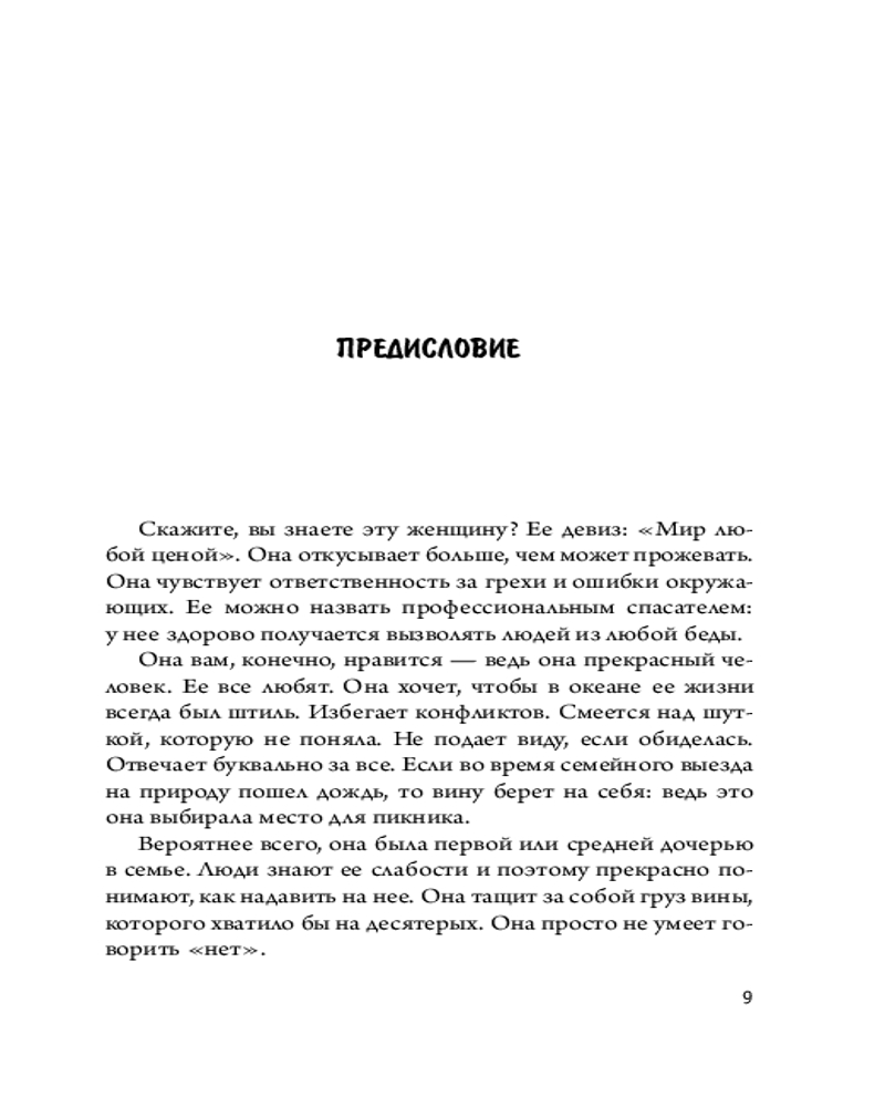Серия: Книги, о которых говорят Ее жизненный девиз — мир любой ценой. Она в ответе за неудачи других людей и регулярно вытаскивает их из разных неурядиц. Люди знают ее слабые места, а она не знает, как сказать «нет». |