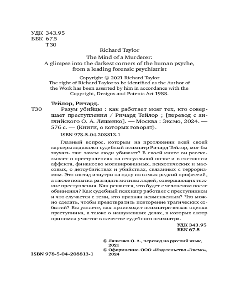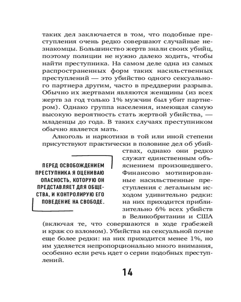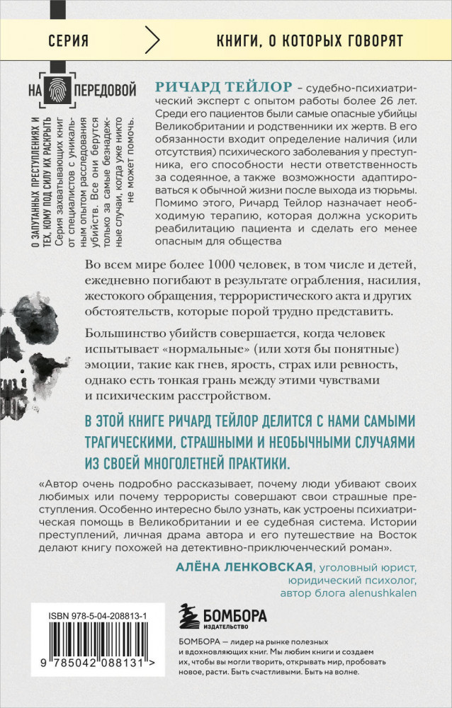 Серия: Книги, о которых говорят Судебные психиатры — это немногочисленная группа врачей, главная задача которых — выяснить мотивы человека, находящегося под стражей, и установить, почему было совершено преступление. Для работы в этой сфере нужны крепкие нервы, хороший желудок, понимание юридического и психиатрического языка, а еще умение заглянуть в бездну и при этом не отшатнуться, увидев на самой ее глубине настоящее чудовище. Чтобы понять, какой человек сидит перед ним, судебный психиатр обычно задает ему разные вопросы: о семье, о работе или о новых интересах. Ричард Тейлор рассказывает, как проводится судебно-психиатрическая экспертиза и оценка людей, совершивших тяжкое преступление и готовящихся к выходу на свободу. Его книга — это сборник случаев из его практики, среди которых есть нашумевшие дела, и размышление о природе человеческой психики. |