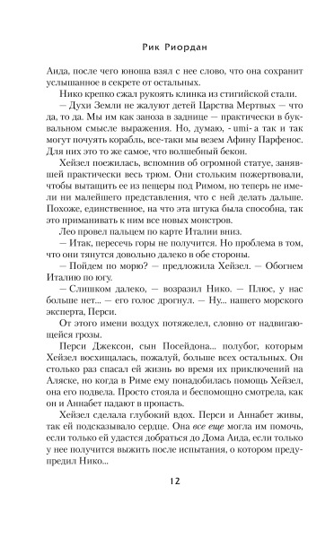 В общем сама книга отличная. Герои интересные. Сыну очень нравится, но хочу чтобы вы знали, где то во второй половине этой книги выяснится что Нико ди Анжело влюблен в Перси Джексона, то есть он еще и гей. И упоминания о его страданиях и переживаниях будет посвящено примерно 2 главы. Это меня сильно смутило. зачем? Не то чтобы не толерантна, но сильно против того, чтобы детям промывали мозги на эту тему, еще в таком возрасте, как 7-12 лет. Рано еще.