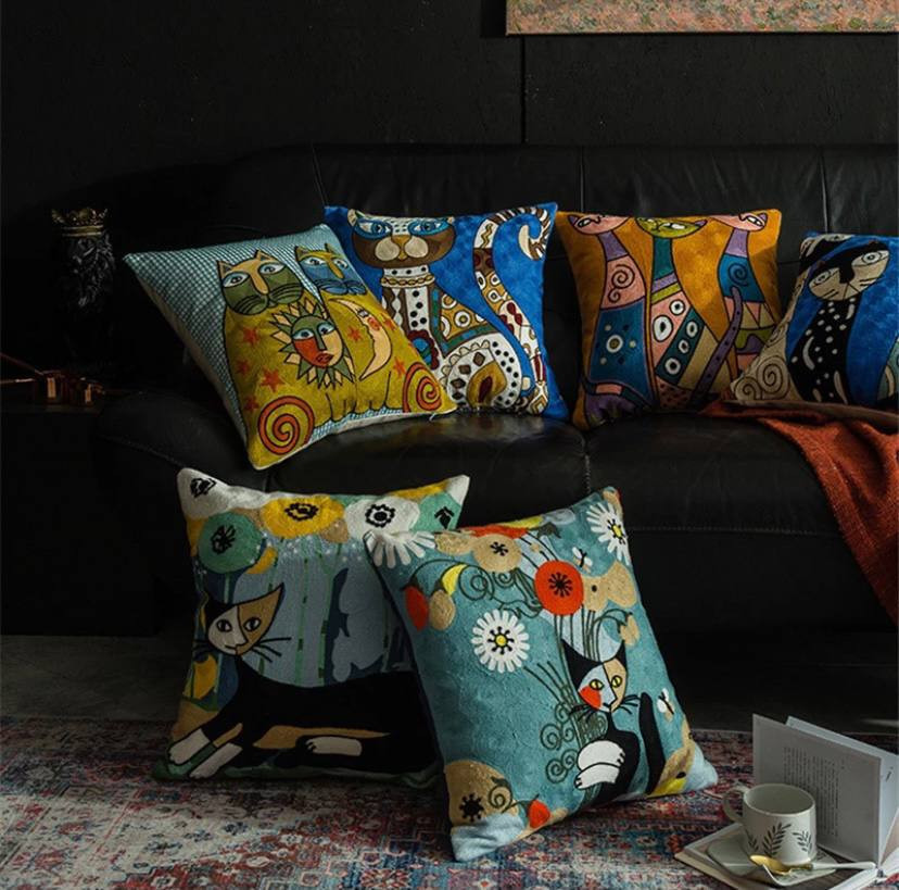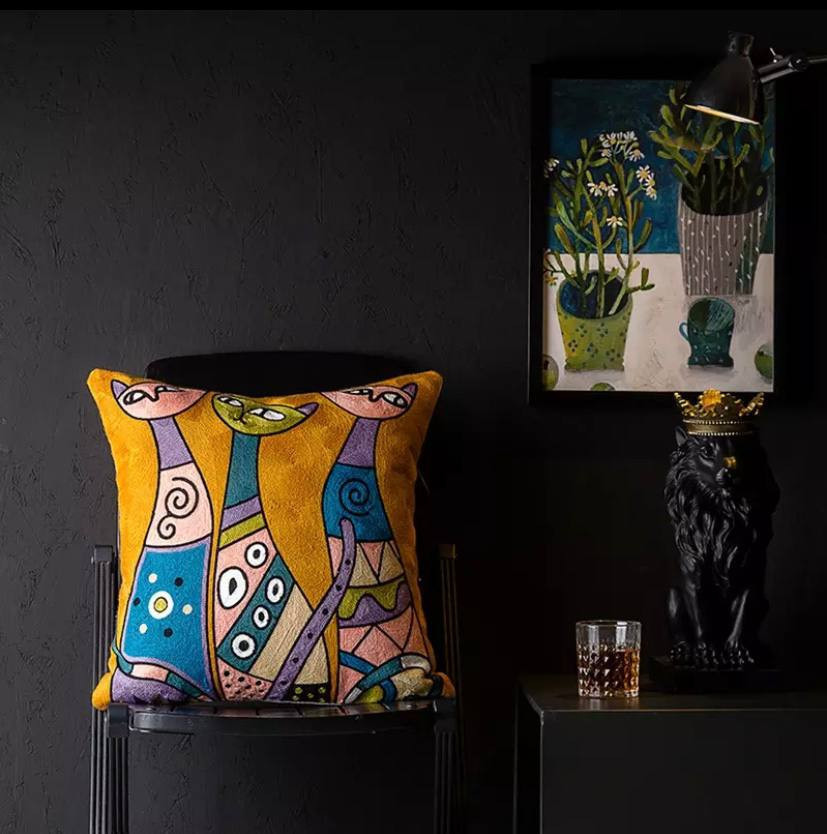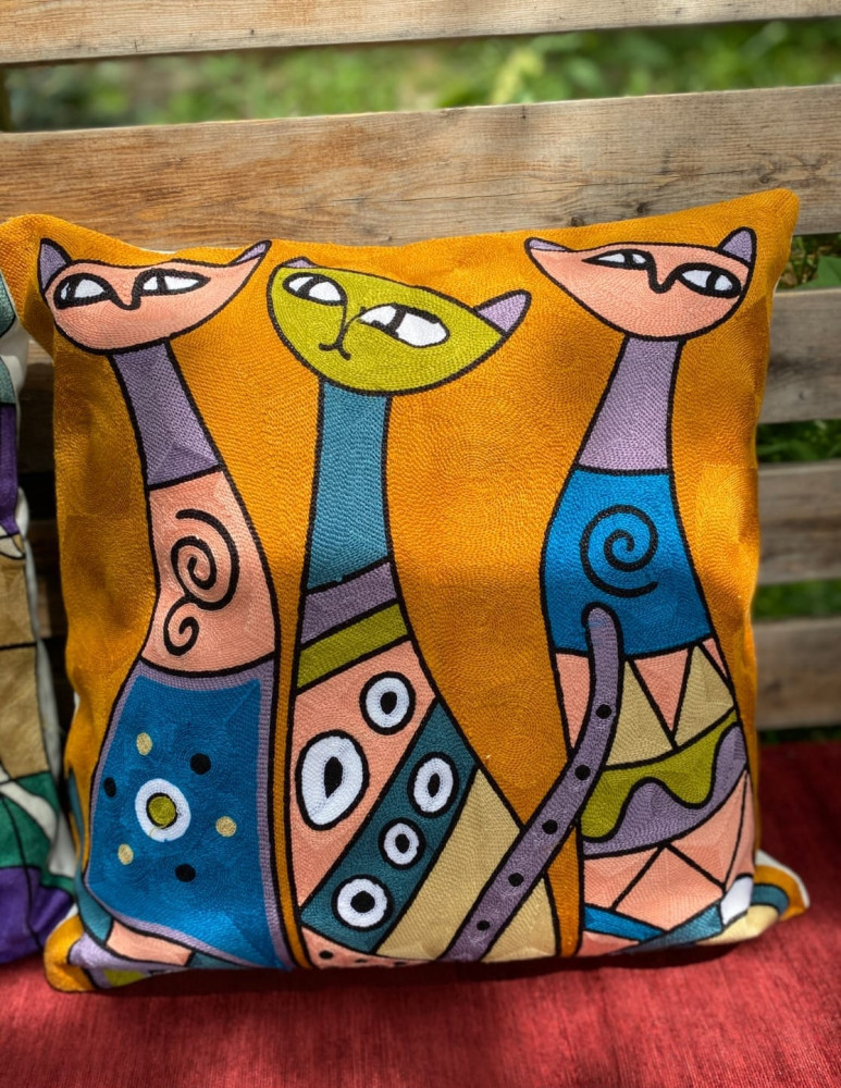 Желтый фон создает создает теплую и радостную атмосферу. Подушки хорошо подходят для детских комнат, создавая радостную атмосферу, а также могут быть использованы в гостиных для добавления ярких акцентов. Они могут легко сочетаться с другими подушками, пледами и текстилем, создавая гармоничный и уютный декор. Эти подушки станут отличным подарком для детей или любителей кошек, принося радость и уют в их жизнь.