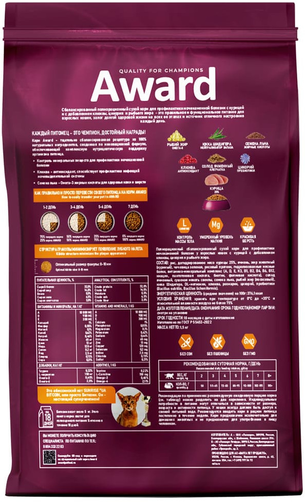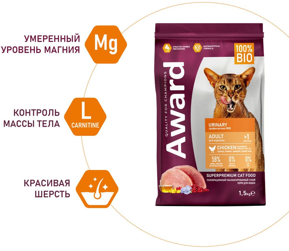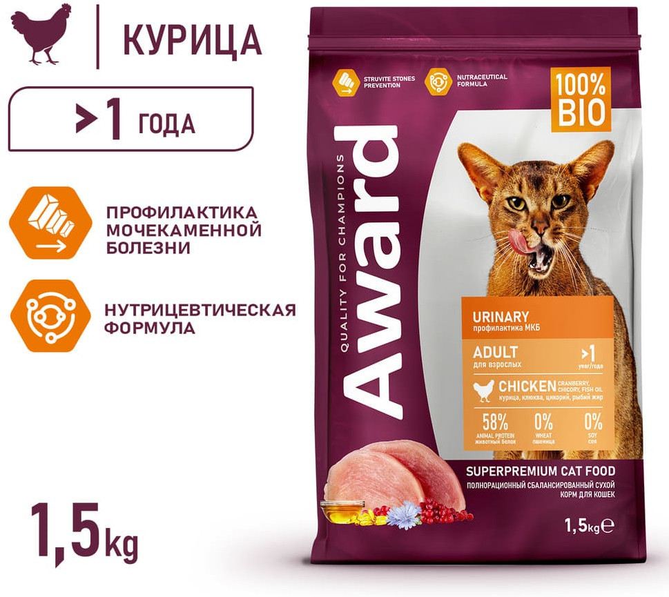 Award Корм для кошек для профилактики мочекаменной болезни с курицей «Urinary»