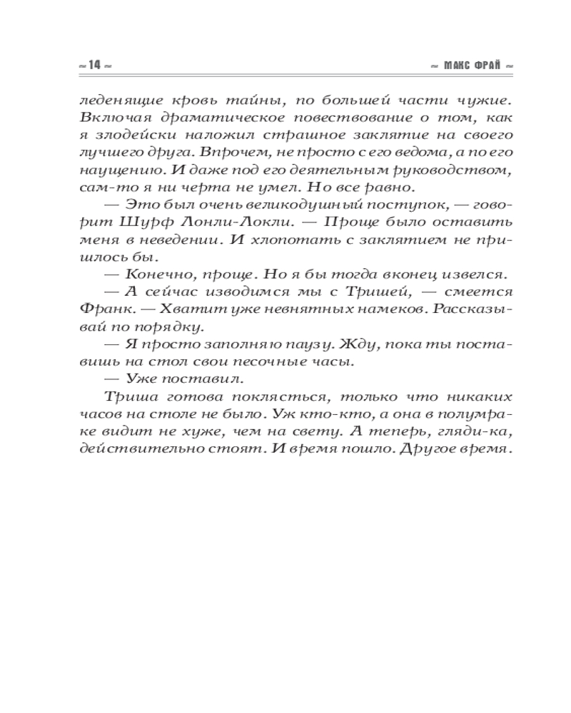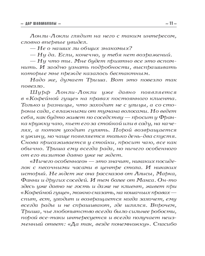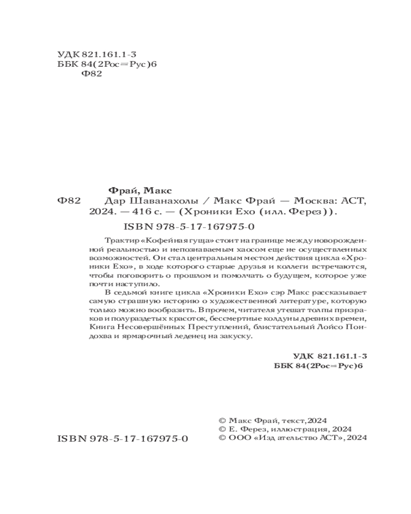 💳 Оплатить за товар можно при получении 🇰🇿 Есть бесплатная доставка по Казахстану от 1 дня 🎁 Копите бонусы с каждой покупки Серия: Хроники Ехо (илл. Ферез) Трактир «Кофейная гуща» стоит на границе между новорожденной реальностью и непознаваемым хаосом еще не осуществленных возможностей. Он стал центральным местом действия цикла «Хроники Ехо», в ходе которого старые друзья и коллеги встречаются, чтобы поговорить о прошлом и помолчать о будущем, которое уже почти наступило. |