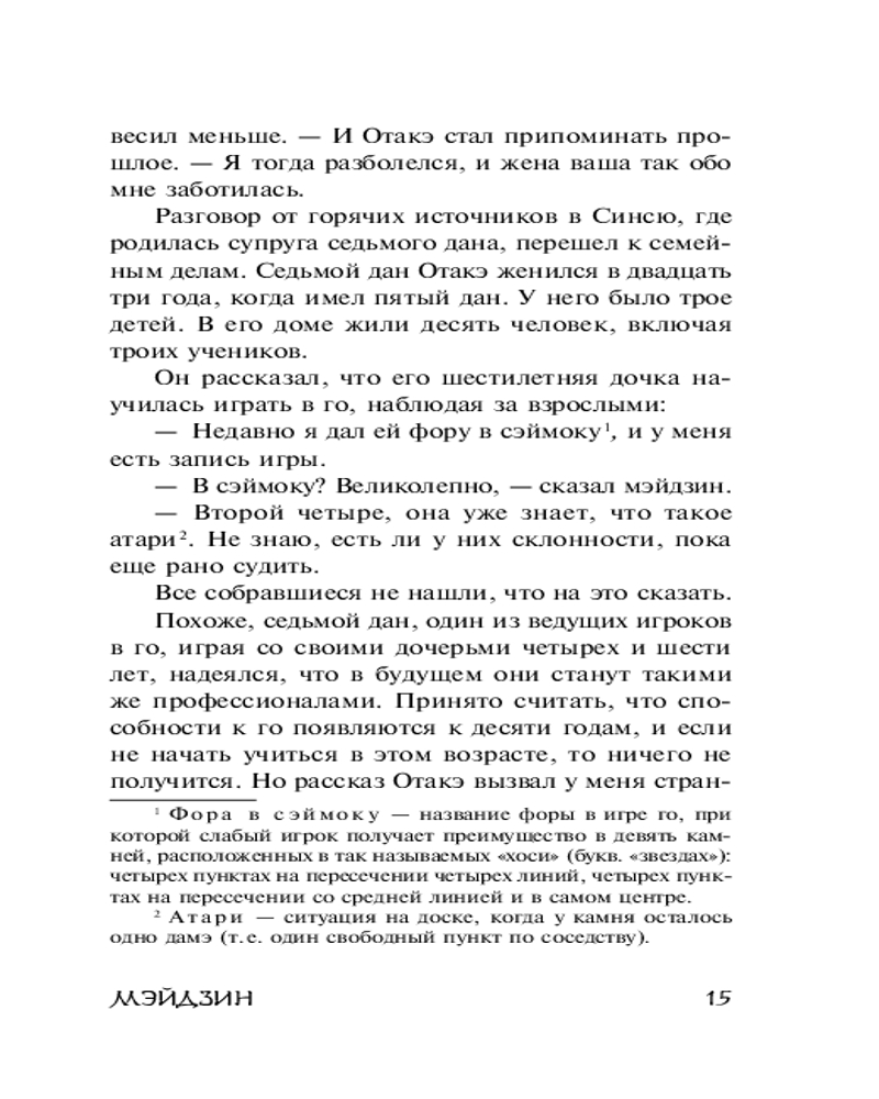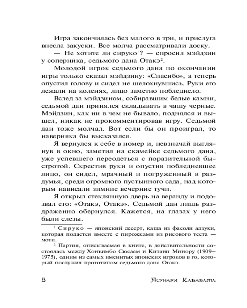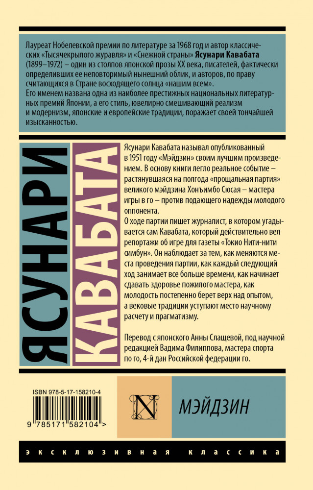 💳 Оплатить за товар можно при получении 🇰🇿 Есть бесплатная доставка по Казахстану от 1 дня 🎁 Копите бонусы с каждой покупки Серия: Эксклюзивная классика Ясунари Кавабата называл опубликованный в 1951 году «Мэйдзин» своим лучшим произведением. В основу книги легло реальное событие — растянувшаяся на полгода «прощальная партия» великого мэйдзина Хонъимбо Сюсая — мастера игры в го — против подающего надежды молодого оппонента. |