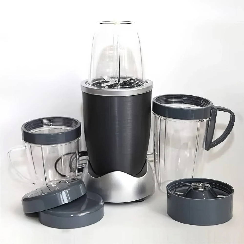 Комплектация: основание с мощным двигателем — 1 шт., большая чаша (0,7 л) — 1 шт., небольшая чаша (0,5 л) — 1 шт. + уплотнитель с ручкой — 1 шт., небольшая чаша с ручкой (0,5 л) — 1шт. + уплотнитель — 1 шт., плоское лезвие (для измельчения) — 1 шт., двойное лезвие (для экстракции) — 1 шт., крышки многоразовые для сохранения свежести продуктов — 2 шт., руководство пользователя — 1 шт. |