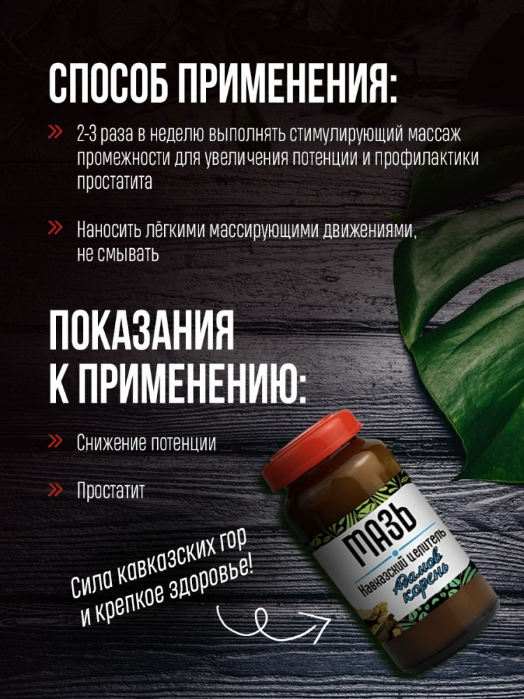 💳 Оплатить за товар можно при получении 🇰🇿 Есть бесплатная доставка по Казахстану от 1 дня 🎁 Копите бонусы с каждой покупки Мазь «Адамов корень» способствует возбуждению полового влечения. Положительный эффект обусловлен тем, что жирные масла корней растения стимулируют кровоток и воздействуют на нервные окончания. Адамов корень благотворно влияет на эректильную функцию у мужчин, улучшает половую активность и оказывает противовоспалительное действие при патологиях органов мочеполовой системы. |