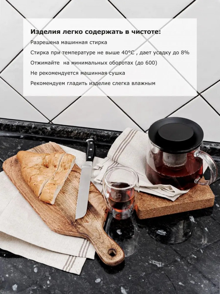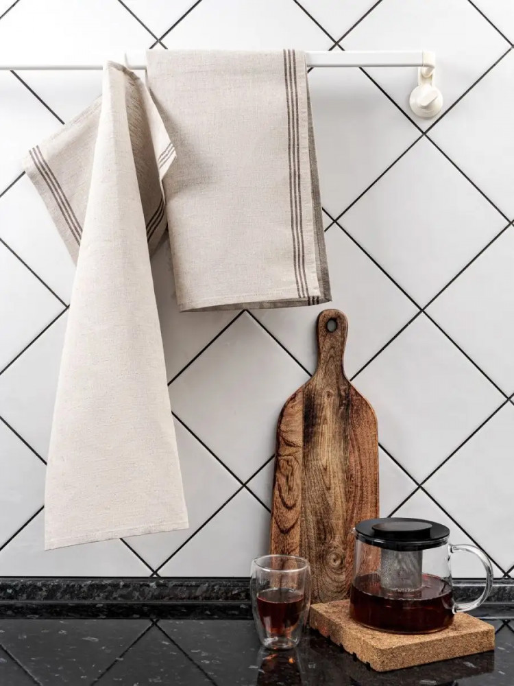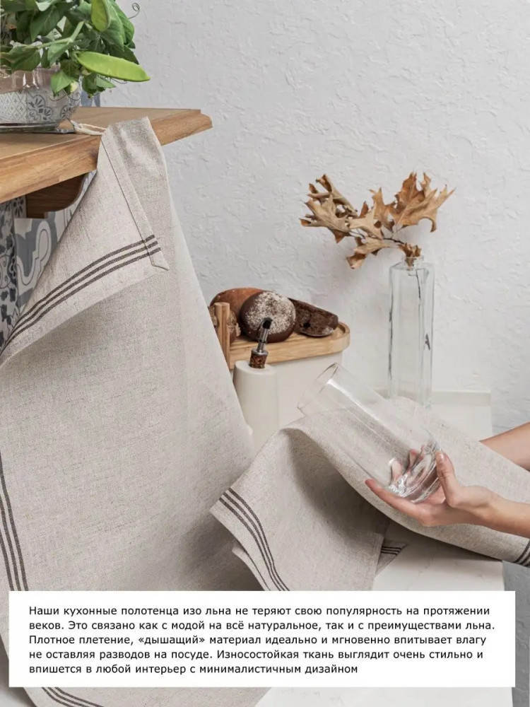 Льняные кухонные полотенца — незаменимые помощники на кухне. Полотенце кухонное льняное с петелькой подходит для рук и для уборки кухни: очищает посуду от разводов, не оставляет ворсинок. Льняная ткань обеспечит изделию длительный срок эксплуатации. Кухонные полотенца мягкие, имеют повышенный срок службы (в 5 раз выше, чем хлопок (например, сравнивая полотенце вафельное, полотенце махровое, из рогожки). Льняная ткань легко впитывает влагу, быстро сохнет, выполняет функцию природного антисептика, не накапливают запах. Эффективно абсорбируют большие объемы воды с посуды. Можно хранить, повесив на крючки или держатель для полотенец. Разрешена машинная стирка при температуре не выше 40°С. Кухонный набор — это полезный и необходимый подарок в любой дом!