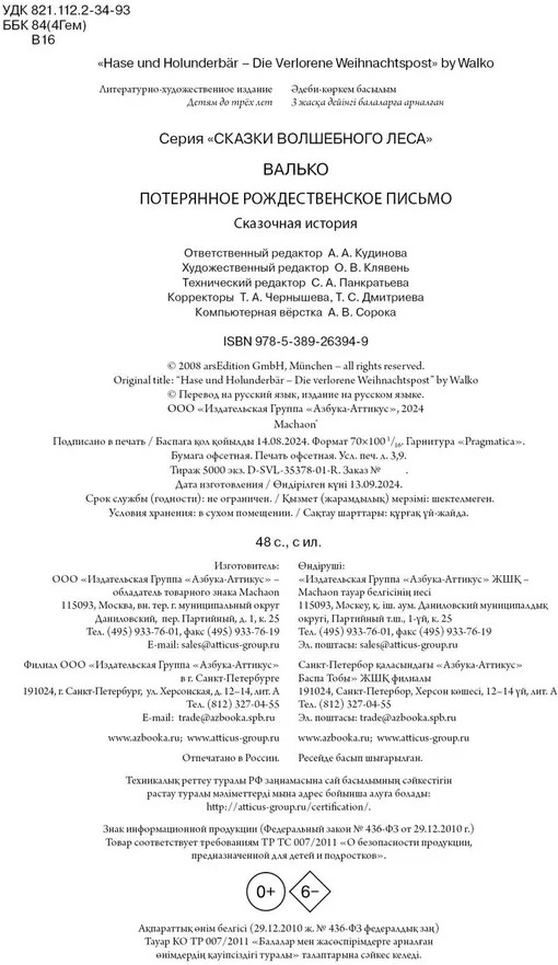 💳 Оплатить за товар можно при получении 🇰🇿 Есть бесплатная доставка по Казахстану от 1 дня 🎁 Копите бонусы с каждой покупки Серия: Сказки Волшебного леса В Волшебном лесу царит праздничное настроение. Рождество не за горами, и лучшие друзья Заяц-рыцарь и Медведь-лакомка с нетерпением ждут любимого праздника. Вот только случайно к ним прилетает чьё-то письмо, предназначенное самому Деду Морозу. Тогда храбрые зверята решают во что бы то ни стало доставить потерянное письмо! Трогательная сказочная история напомнит каждому о том, что дружба и вера в чудеса помогут преодолеть любые трудности. Присоединяйтесь к увлекательному рождественскому приключению Зайца и Медведя! |