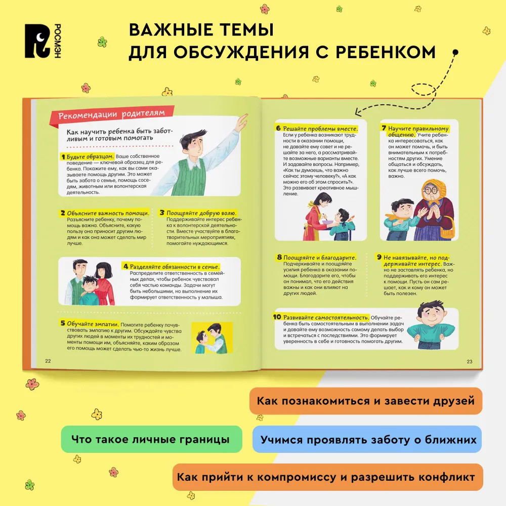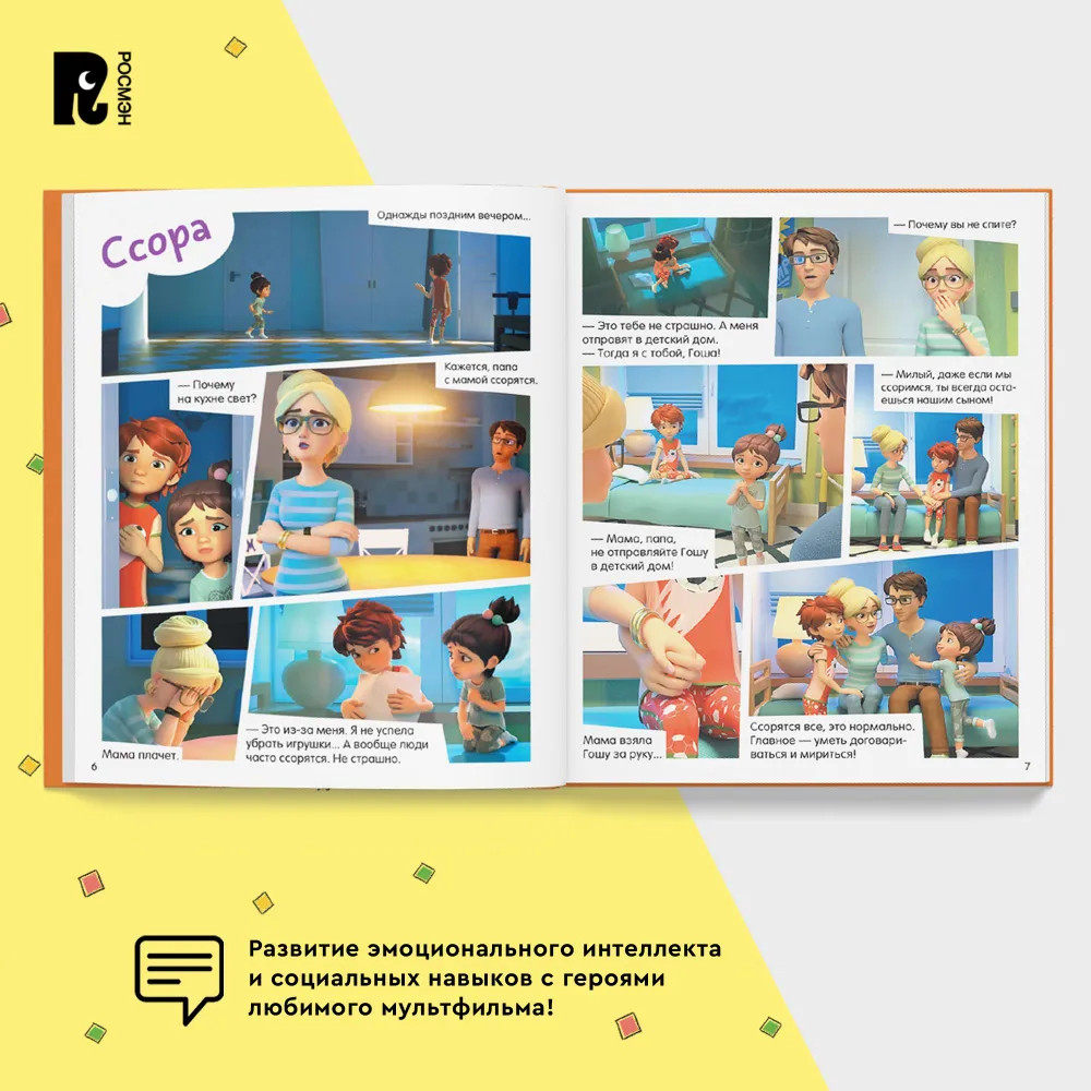 После каждой истории есть комментарии и советы родителям от психологов проекта про Миру и Гошу. Они помогут разобрать причины поднятых в сказках проблем, проговорить важные моменты и обсудить, как действовать в сложной ситуации в будущем. Закрепить новые знания на практике помогут веселые игры и задания.