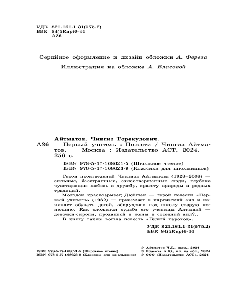 💳 Оплатить за товар можно при получении 🇰🇿 Есть бесплатная доставка по Казахстану от 1 дня 🎁 Копите бонусы с каждой покупки Серия: Классика для школьников Герои произведений Чингиза Айтматова (1928–2008) — сильные, бесстрашные, самоотверженные люди, глубоко чувствующие любовь и дружбу, красоту природы и родных традиций. Молодой красноармеец Дюйшен — герой повести «Первый учитель» (1962) — приезжает в киргизский аил и начинает обучать детей, оборудовав под школу старую конюшню. Как сложится судьба его ученицы Алтынай — девочки-сироты, проданной в жены в соседний аил?.. |