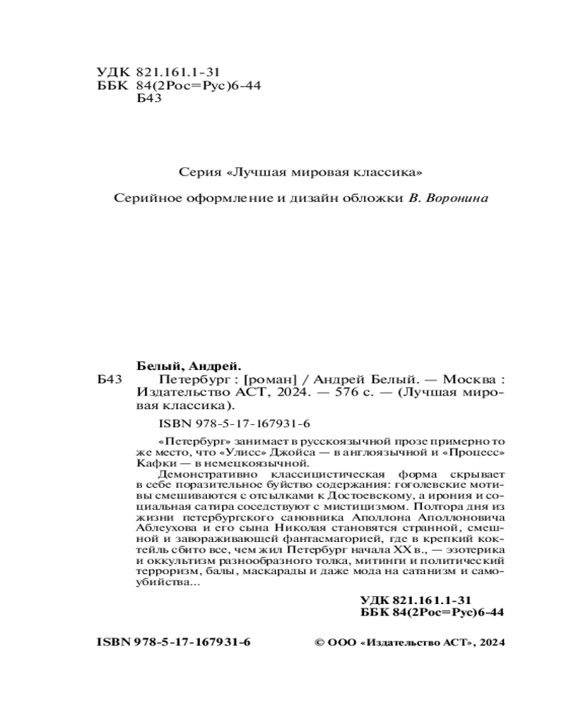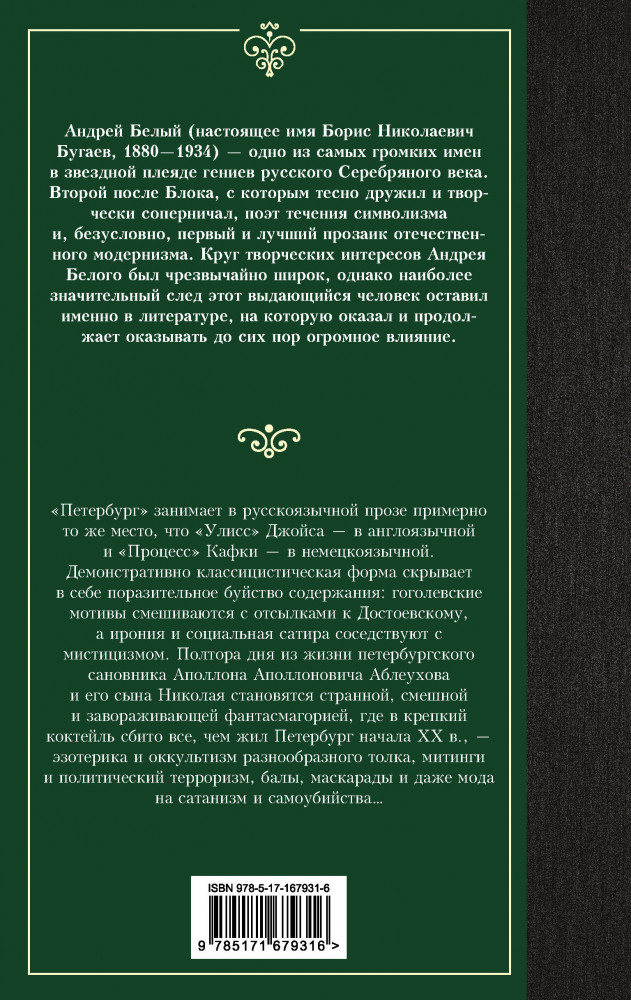 💳 Оплатить за товар можно при получении 🇰🇿 Есть бесплатная доставка по Казахстану от 1 дня 🎁 Копите бонусы с каждой покупки Серия: Лучшая мировая классика «Петербург» занимает в русскоязычной прозе примерно то же место, что «Улисс» Джойса — в англоязычной и «Процесс» Кафки — в немецкоязычной. |