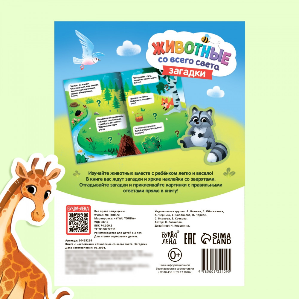 💳 Оплатить за товар можно при получении 🇰🇿 Есть бесплатная доставка по Казахстану от 1 дня 🎁 Копите бонусы с каждой покупки Изучайте животных вместе с ребёнком легко и весело! В книге вас ждут загадки и яркие наклейки со зверятами. Отгадывайте загадки и приклеивайте картинки с правильными ответами прямо в книгу! |