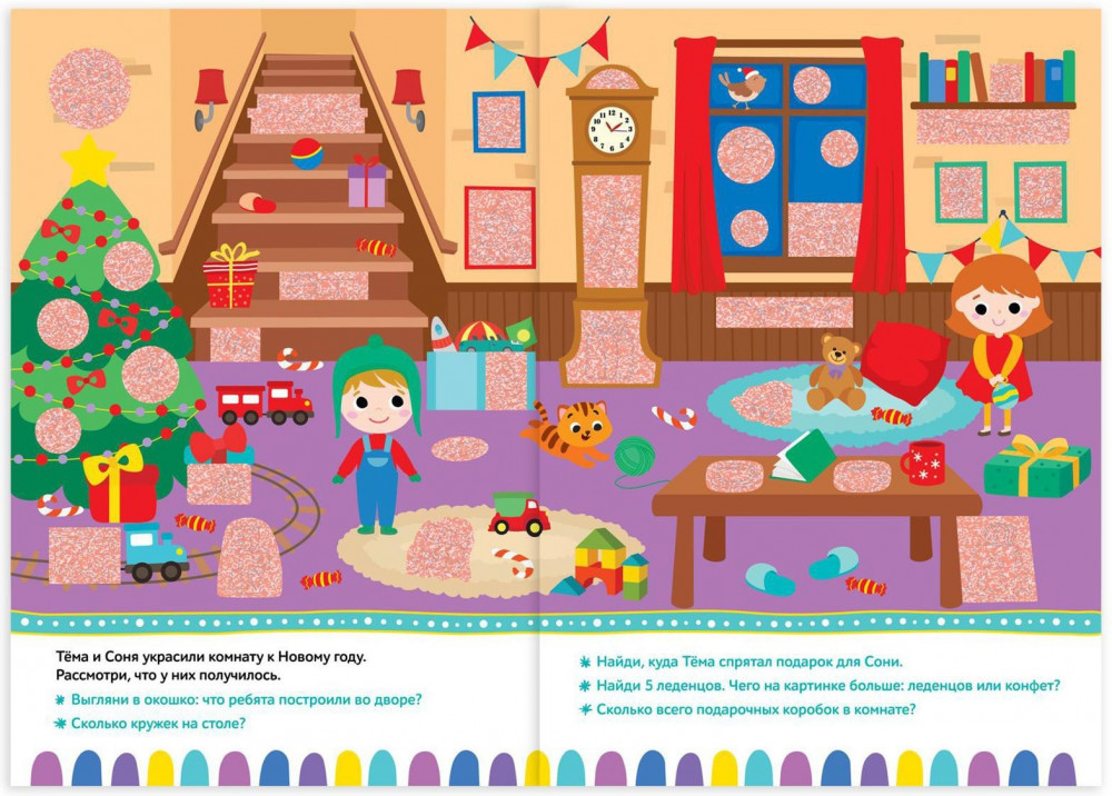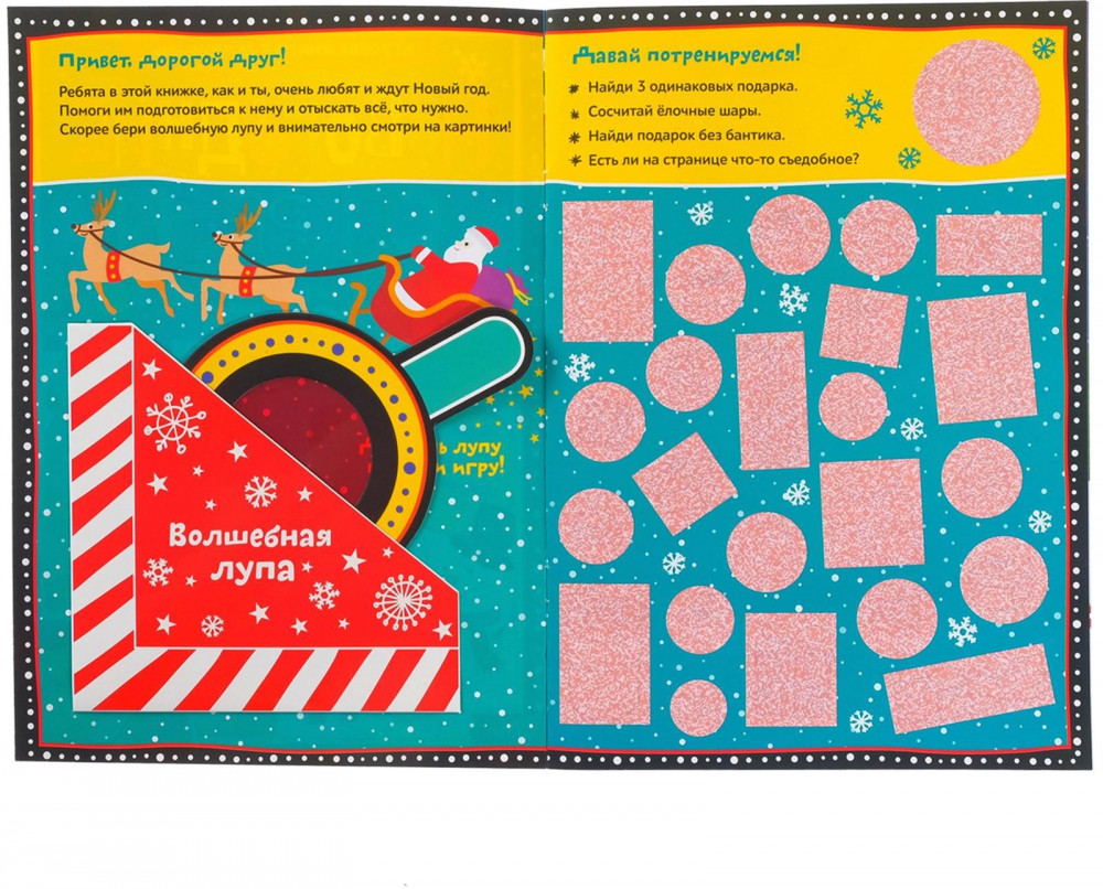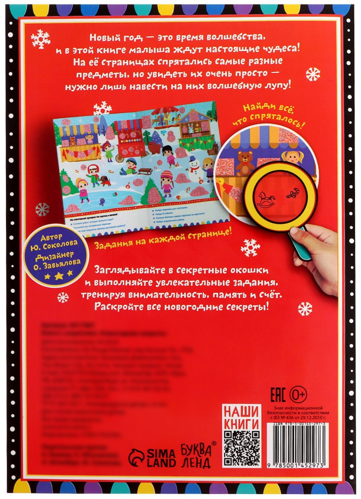Новогодние секреты. Игровая книга с заданиямиВ данный момент этот товар отсутствует в продаже. Возможно, у нас найдется аналогичный или похожий товар здесь. Серия: Новогодние книги Буква-Ленд С этой книгой ждать праздника будет интереснее и веселее. Вместе с ребёнком помогите героям подготовиться к Новому году и отыскать всё, что для этого пригодится. А поможет вам волшебная лупа. Наводите её на разные фрагменты картинок, отмеченные специальной краской, и узнайте, что построили герои книги во дворе и куда спрятали новогодние подарки. Внутри книги вас ждут увлекательные задания, красочные картинки и милые сказочные персонажи. |