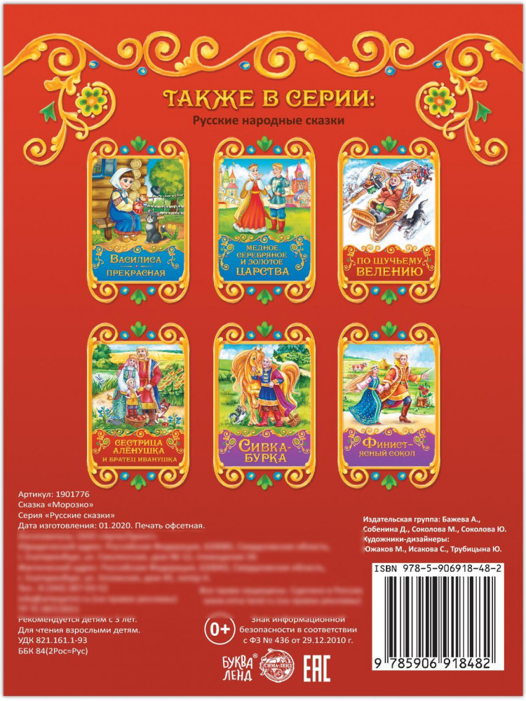 МорозкоВ данный момент этот товар отсутствует в продаже. Возможно, у нас найдется аналогичный или похожий товар здесь. Серия: Мои первые сказки Буква-Ленд Какой ребёнок не любит сказки? Они скрашивают досуг крохи, способствуют развитию речи и нравственному воспитанию, помогают научиться воспринимать текст на слух. Старайтесь как можно раньше привить малышу любовь к чтению — это полезная привычка, которая пригодится ему на протяжении всей жизни. Чадо будет в восторге от волшебных историй и красочных иллюстраций, а родителей порадует формат книги, крупный шрифт, удобный для чтения, и привлекательная цена. Книга рекомендована детям старше 3 лет. |