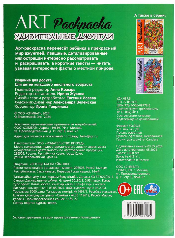 💳 Оплатить за товар можно при получении 🇰🇿 Есть бесплатная доставка по Казахстану от 1 дня 🎁 Копите бонусы с каждой покупки Серия: Арт-раскраска Арт-раскраска «Удивительные джунгли» ТМ «УМка» — креативный альбом для юных художников: |