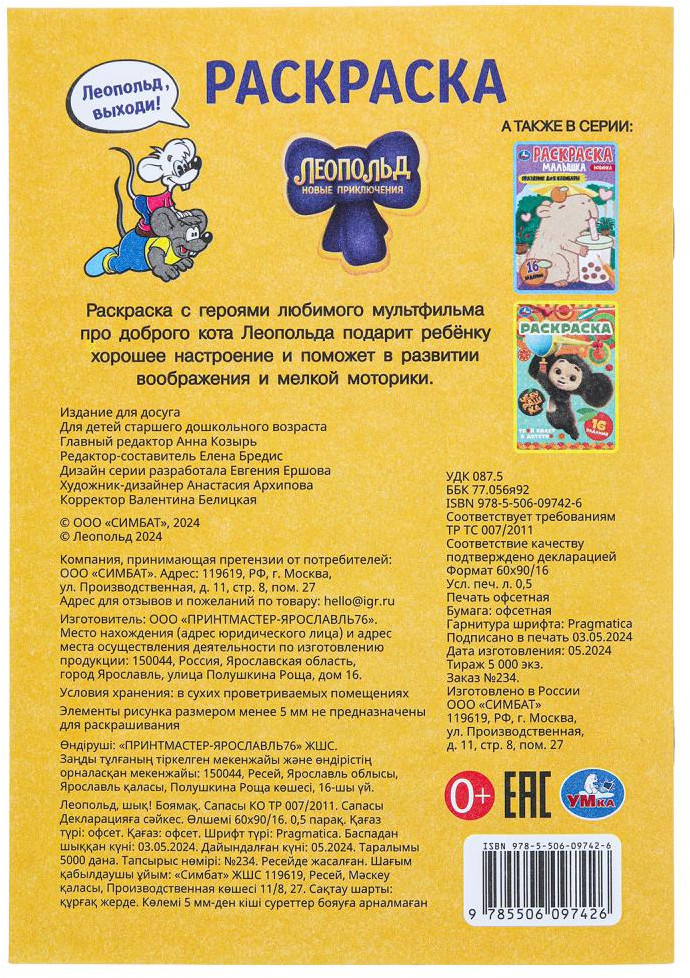💳 Оплатить за товар можно при получении 🇰🇿 Есть бесплатная доставка по Казахстану 🎁 Копите бонусы с каждой покупки Раскраска-малышка «Леопольд, выходи!» ТМ «УМка» непременно понравится маленькому поклоннику мультфильма «Леопольд. Новые приключения»: |