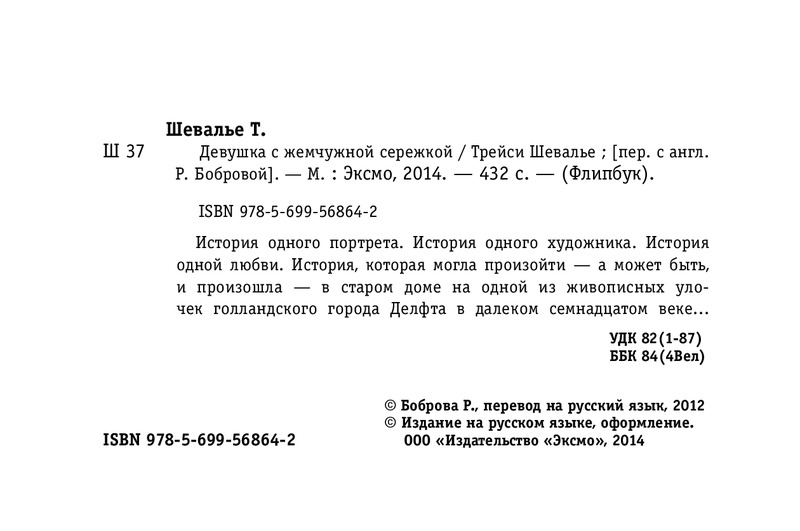 Девушка с жемчужной сережкойВ данный момент этот товар отсутствует в продаже. Возможно, у нас найдется аналогичный или похожий товар здесь. Серия: Флипбук (обложка) История одного портрета. История одного художника. История одной любви. История, которая могла произойти — а может быть, и произошла — в старом доме на одной из живописных улочек голландского города Делфта в далеком семнадцатом веке… |