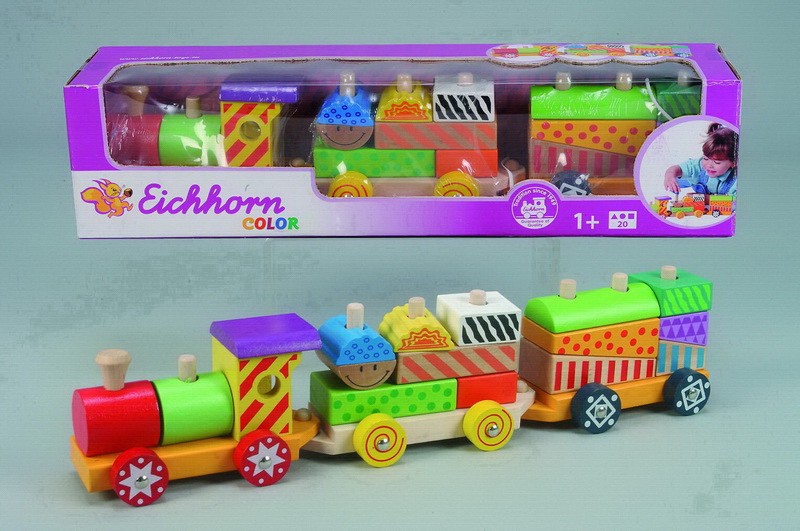 Eichhorn Паровозик-сортер, 41 см, 18 деталейВ данный момент этот товар отсутствует в продаже. Возможно, у нас найдется аналогичный или похожий товар здесь. Деревянный паровозик Eichhorn состоит из паровозика и двух вагончиков. Общая длина состава - 41 см. Паровозик - это одновременно и пирамидка: каждый вагончик и паровозик состоит из платформы с тремя вертикальными палочками, на которые надеваются детали. |