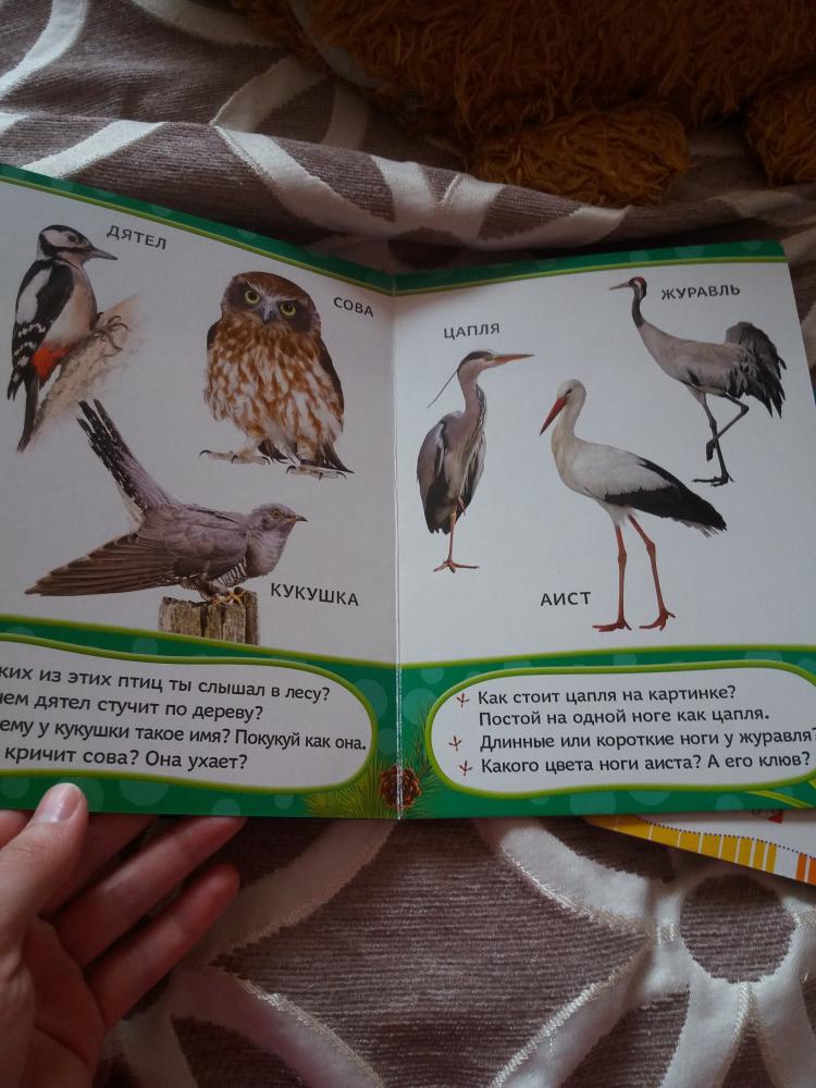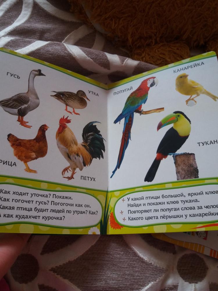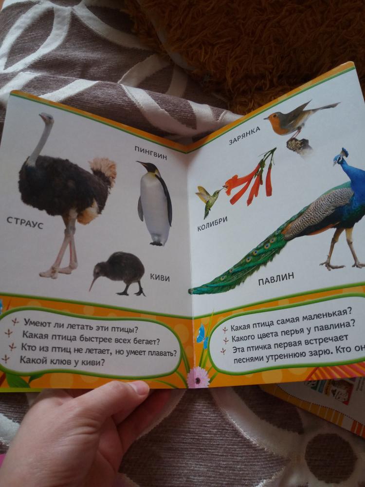 Замечательная книжка, картинки настоящих птиц. Внизу каждой страницы есть вопросы о каждой птице, можно будет с 2-3 летним ребёнком обсудить их. Моему сыну год, ему интересно рассматривать и тыкать пальцем. И еще большой плюс - твердые страницы. Рекомендую!