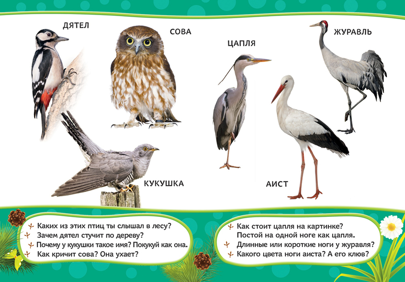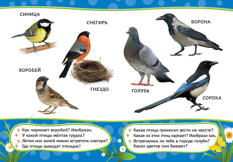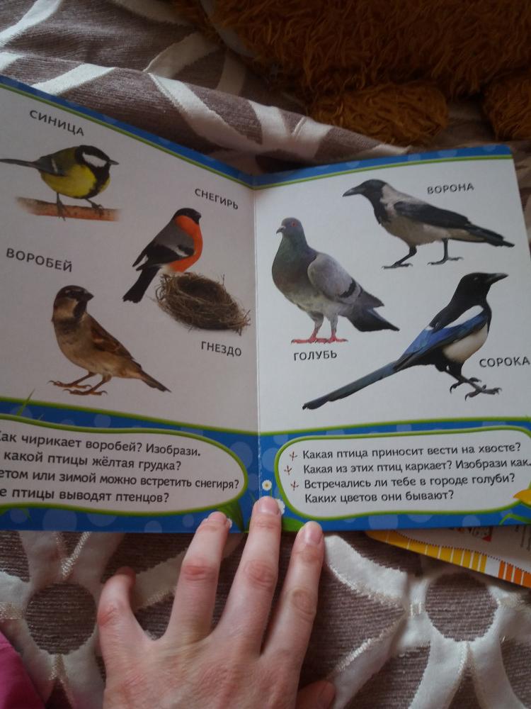 Лидия Замечательная книжка для ознакомления малышей с птицам. Каждая птичка подписана и внизу страничек имеются вопросы-задания для лучшего изучения и запоминания изученных птиц.