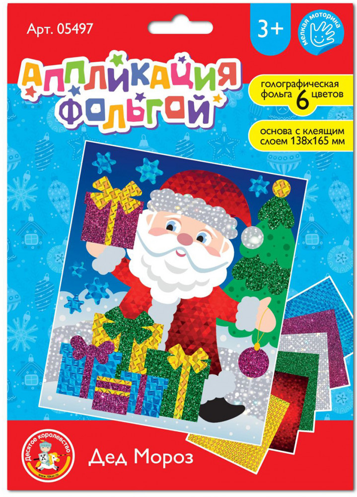 С Набором для аппликации из фольги «Дед Мороз» вы создадите яркую новогоднюю открытку для друзей и близких. В набор входит заготовка с рисунком и листы цветной фольги для декорирования. Создание аппликаций из фольги развивает мелкую моторику, цветовосприятие, концентрацию внимания и творческие способности у детей. Набор рекомендуется для детей в возрасте от 3 лет.