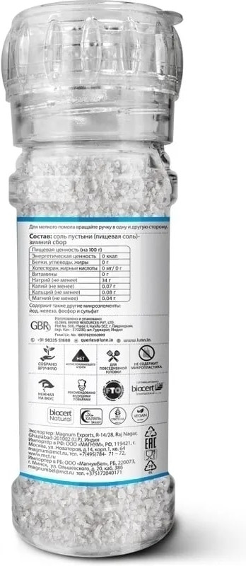 💳 Оплатить за товар можно при получении 🇰🇿 Есть бесплатная доставка по Казахстану от 1 дня 🎁 Копите бонусы с каждой покупки Lunn соль пустыни, зимний сбор — сертифицированный, экологически чистый продукт, богатый большим количеством ценных минералов (натрием, кальцием, магнием, железом и другими). Эти уникальные белоснежные кристаллы добываются зимой в субтропической индийской пустыне Тар — девятой в мире по величине. |