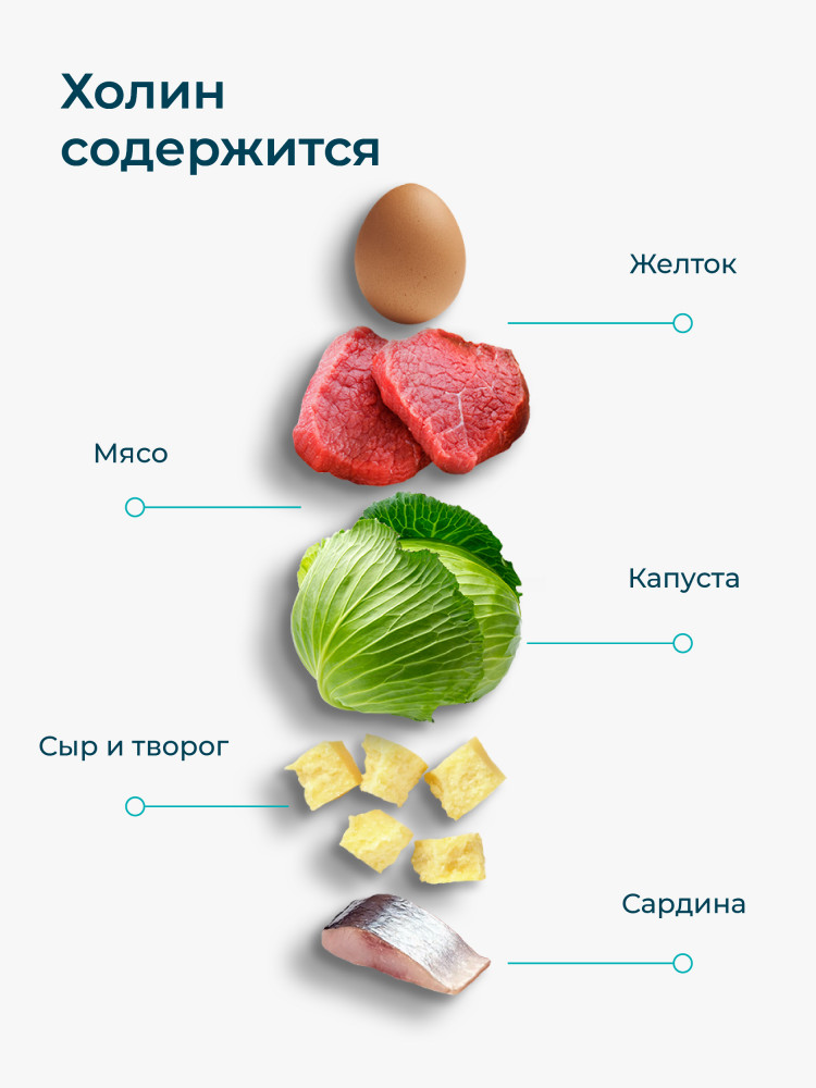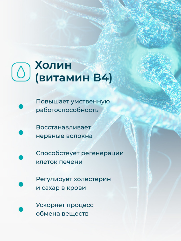 Холин битартрат — это питательное вещество, которое в небольших количествах вырабатывает ваше тело, но его так же необходимо получать из внешних источников, чтобы удовлетворить потребности организма. Холин способствует образованию миелиновой оболочки нервов, от которой зависит защита, питание и скорость передачи импульса в ЦНС и периферической нервной системе. Холин улучшает память и помогает вывести на новый уровень когнитивные функции мозга, помогает справиться с высокими интеллектуальными нагрузками, овладевать новыми знаниями и навыками. Это вещество увеличивает устойчивость мозга к экстремальным проявлениям и помогает эффективнее концентрироваться.