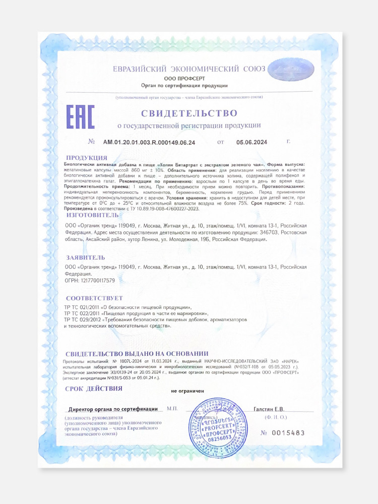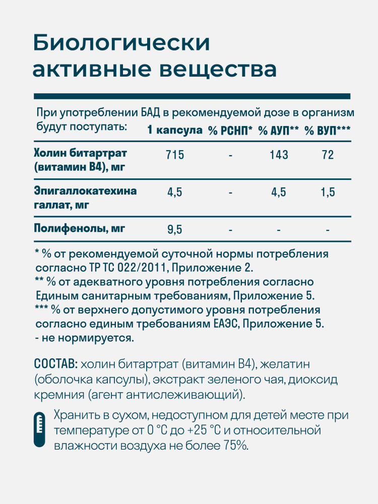 Показания: в качестве биологически активной добавки к пище — как дополнительного источника холина, содержащей полифенол и эпигаллокатехина галат.