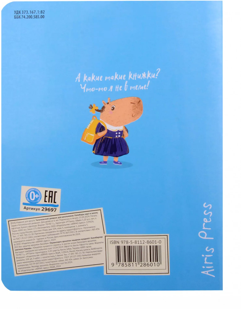 💳 Оплатить за товар можно при получении 🇰🇿 Есть бесплатная доставка по Казахстану от 1 дня 🎁 Копите бонусы с каждой покупки Серия: Читательский дневник Вашему вниманию предлагается Читательский дневник для школьников. Капибары идут в школу |