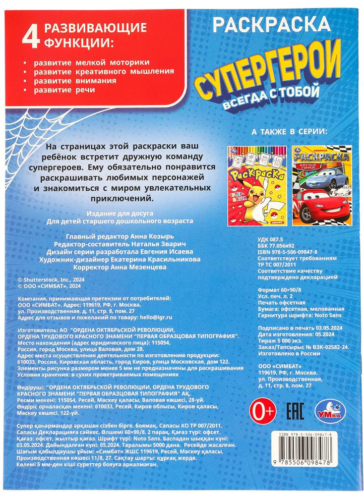 💳 Оплатить за товар можно при получении 🇰🇿 Есть бесплатная доставка по Казахстану от 1 дня 🎁 Копите бонусы с каждой покупки Раскраска «Супергерои всегда с тобой» ТМ «УМка» - отличный подарок для юных художников: |