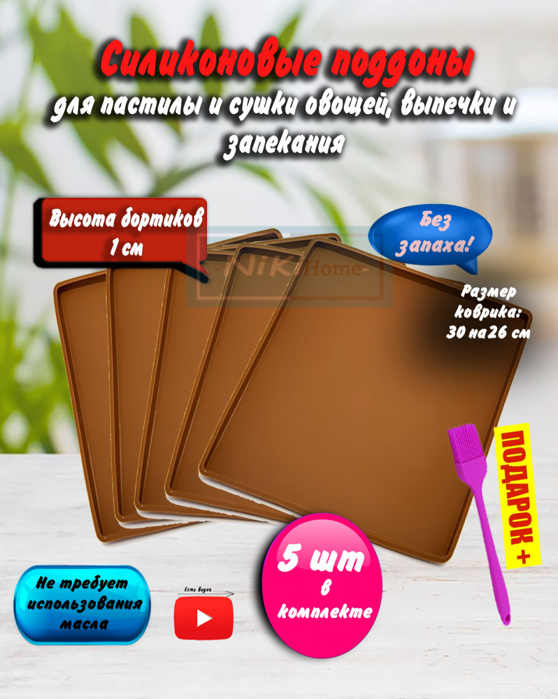 💳 Оплатить за товар можно при получении 🇰🇿 Есть бесплатная доставка по Казахстану от 1 дня 🎁 Копите бонусы с каждой покупки Коврик антипригарный многоразовый (размер по внешней стороне 30 × 26 см, размер по внутренней стороне 29 × 25 см, высота бортиков 1 см, в комплекте 5 шт/) подходит для пастилы, сушки овощей и фруктов и выпечки изделий из теста, в том числе жидкого, а также для приготовления мяса, рыбы, птицы, фаршированных овощей и фруктовых кондитерских десертов, гранолы, печенья, роллов и меренги. Наличие бортика предотвращает вытекание сока, образующегося в процессе приготовления блюда. Антипригарная поверхность; не требуется использование масла и жиров; подходит для всех типов печей. Данные поддоны замечательно подходят для приготовления пастилы в дегидраторе и сушилке. Силиконовый поддон подойдет для сушки грибов, зелени и трав. |