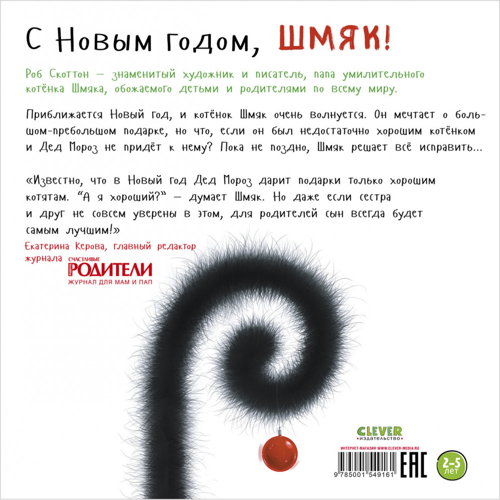 Книга «С Новым годом, Шмяк!» — это праздничный хит в серии про любимого героя детей и взрослых по всему миру. Только в России совокупный тираж перевалил за 1,5 миллиона экземпляров, а тысячи малышей нашли в неунывающем котенке лучшего друга.